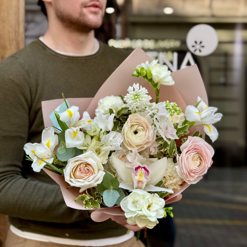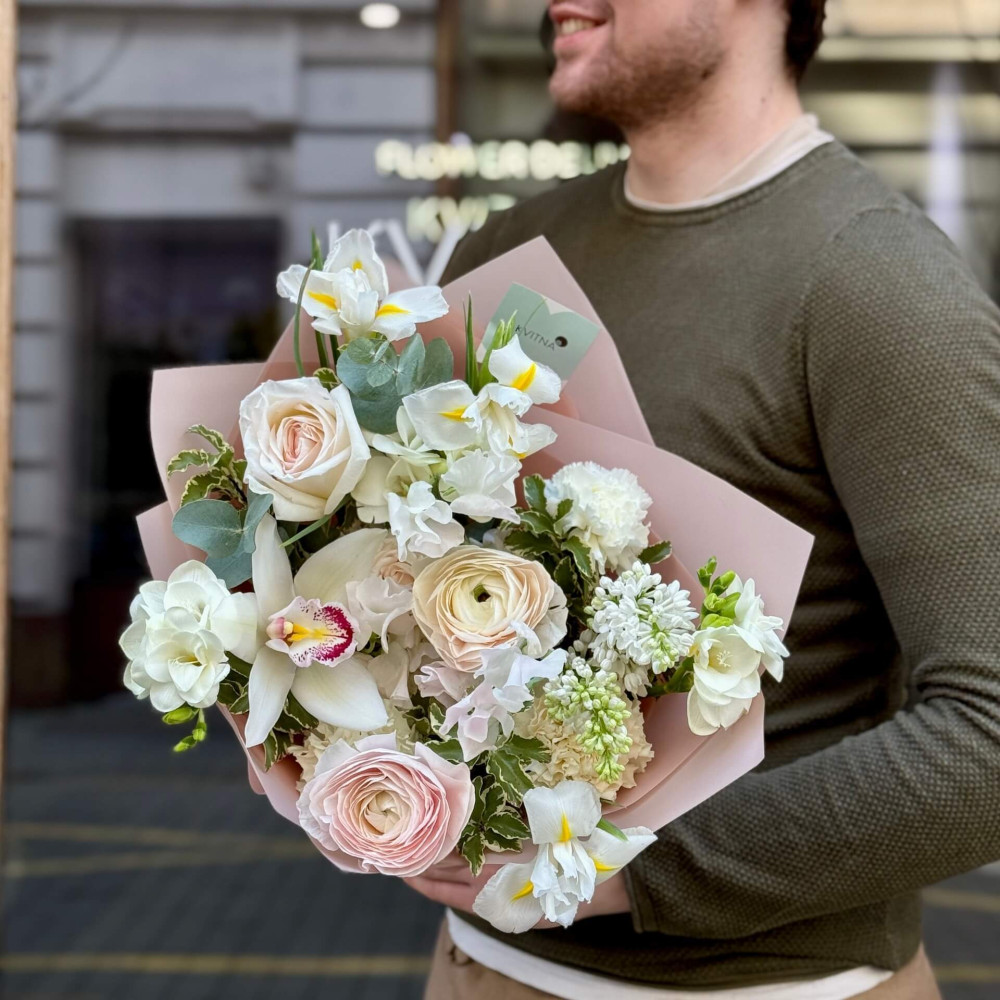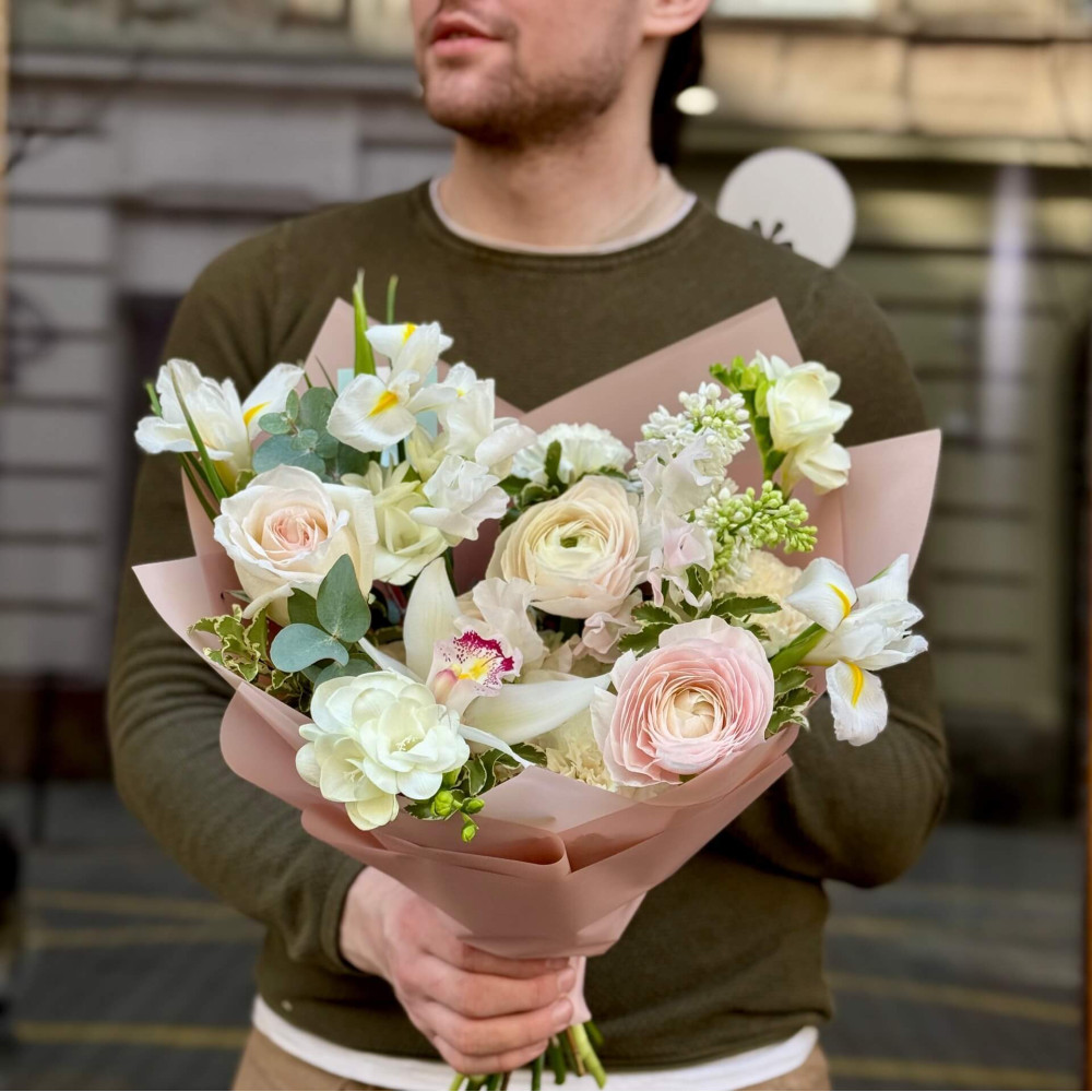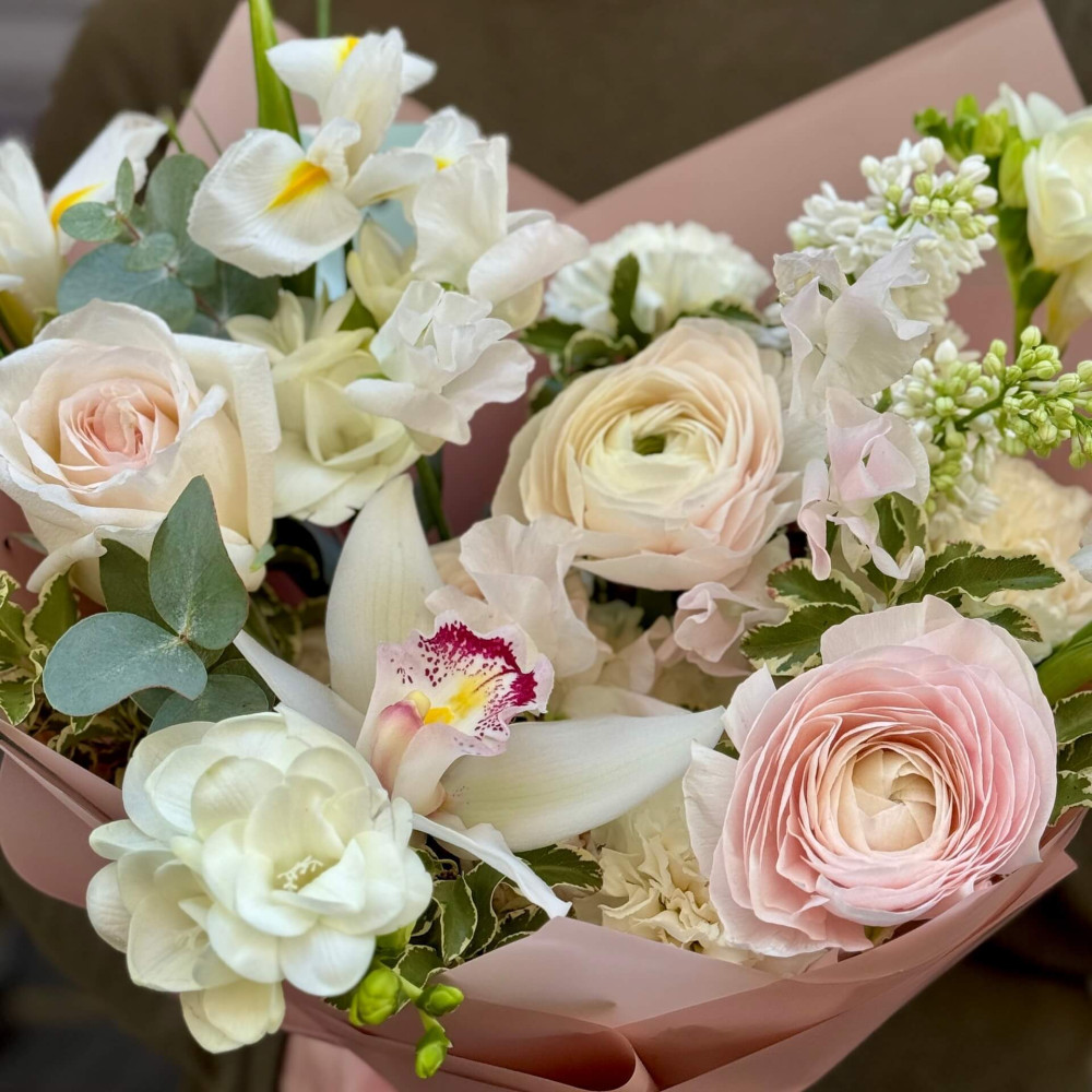 Квіти: Ранункулюс, Троянда піоновидна, Ірис, Бузок, Цимбідіум, Фрезія, Евкаліпт, Латірус, Піттоспорум, Діантус (Гвоздика)