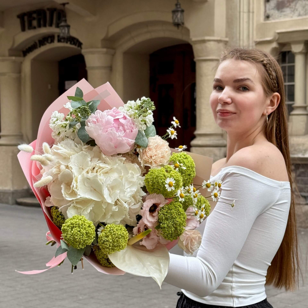 - Як замовити Світлий ніжний букет з гортензією, півонією та антуріумом «Тістечко для мами»? ❯