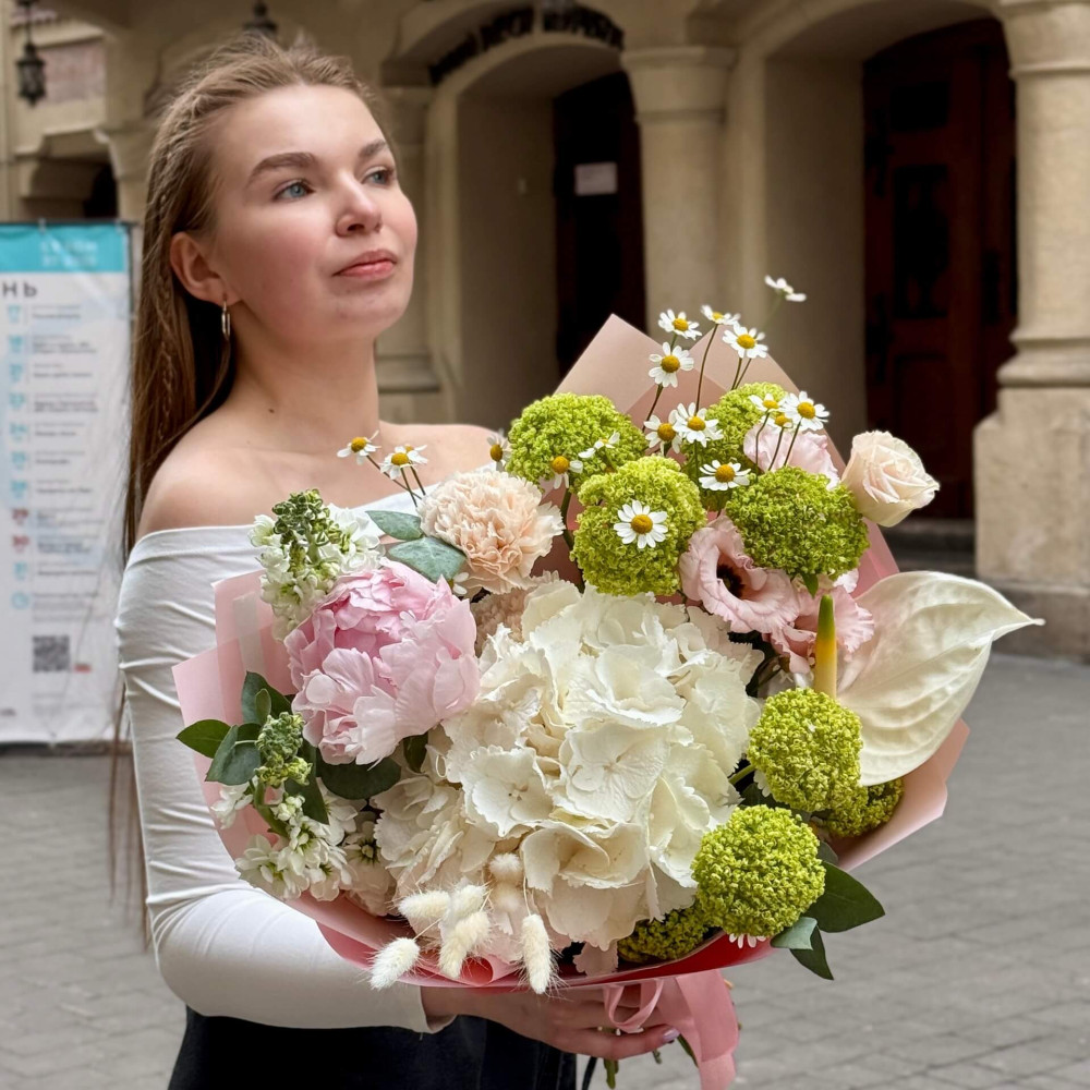 Квіти: Гортензія, Антуріум, Вібурнум, Танацетум, Півонія, Матіола, Діантус (Гвоздика), Еустома, Евкаліпт