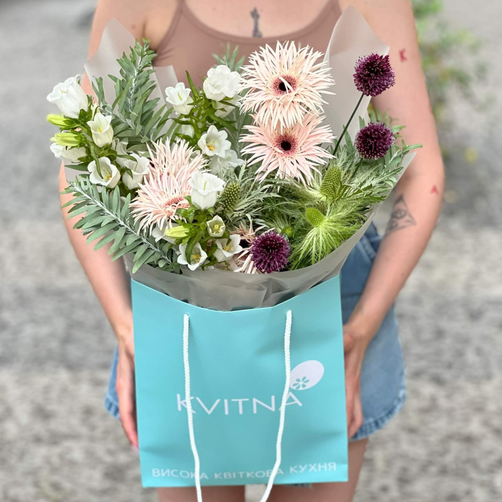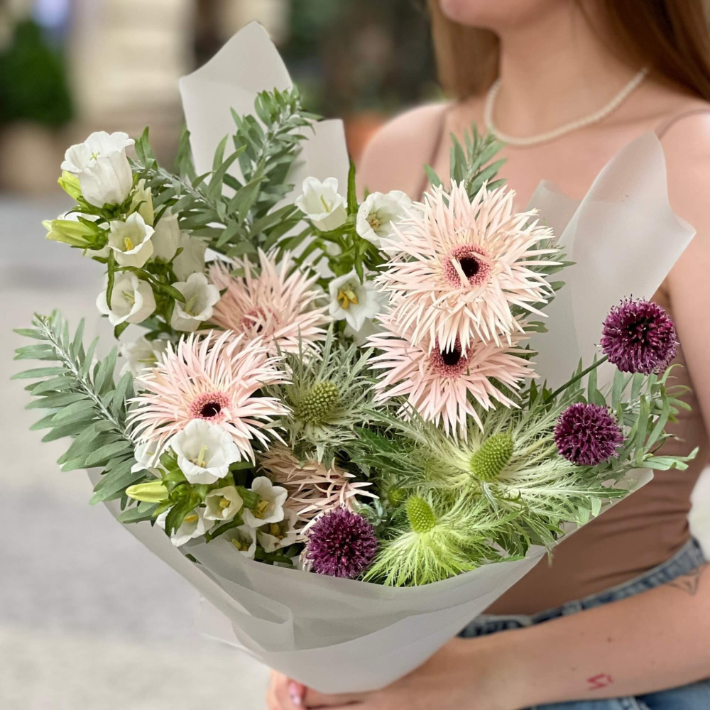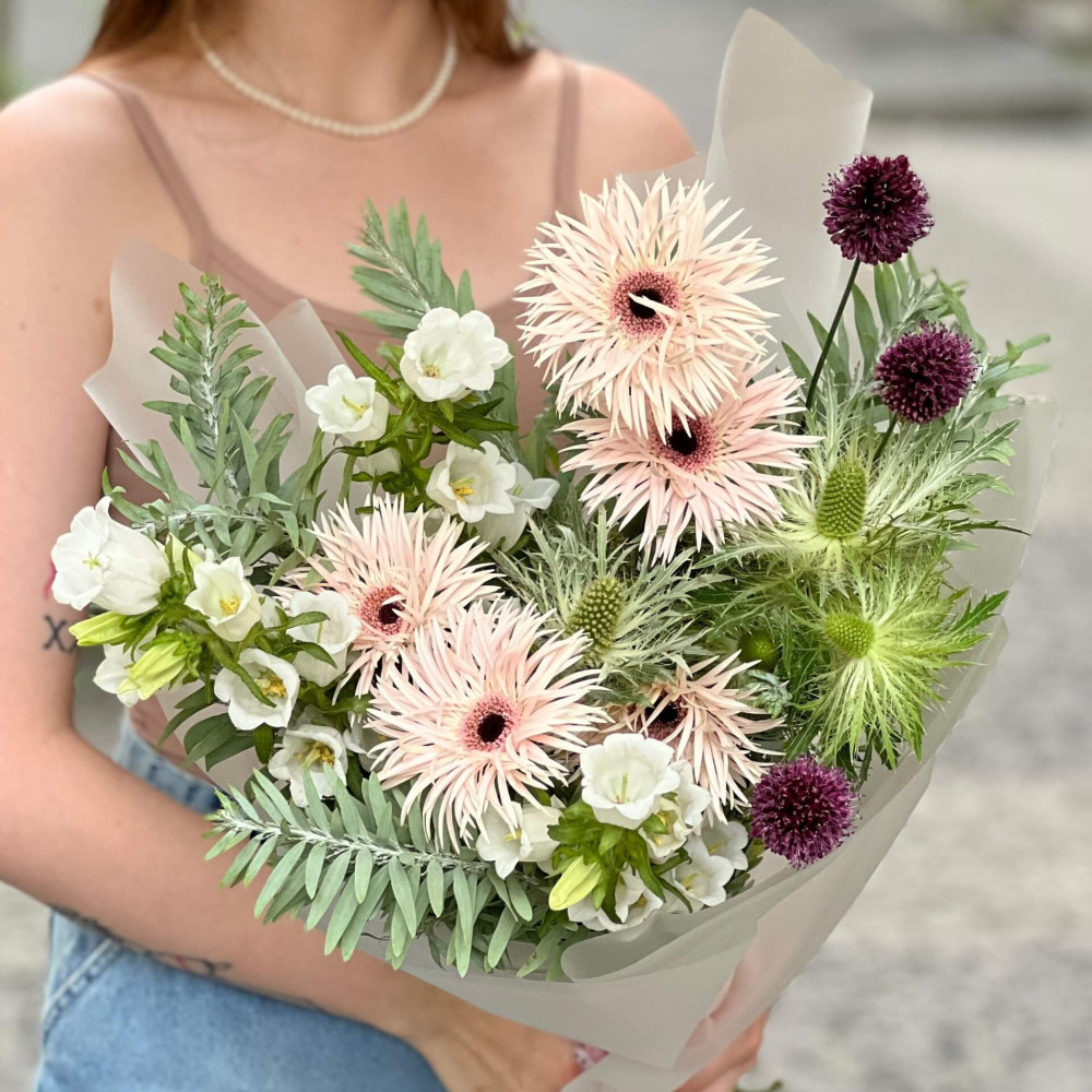 Квіти: Гербера, Ерінгіум, Алліум, Мімоза (листя), Кампанула