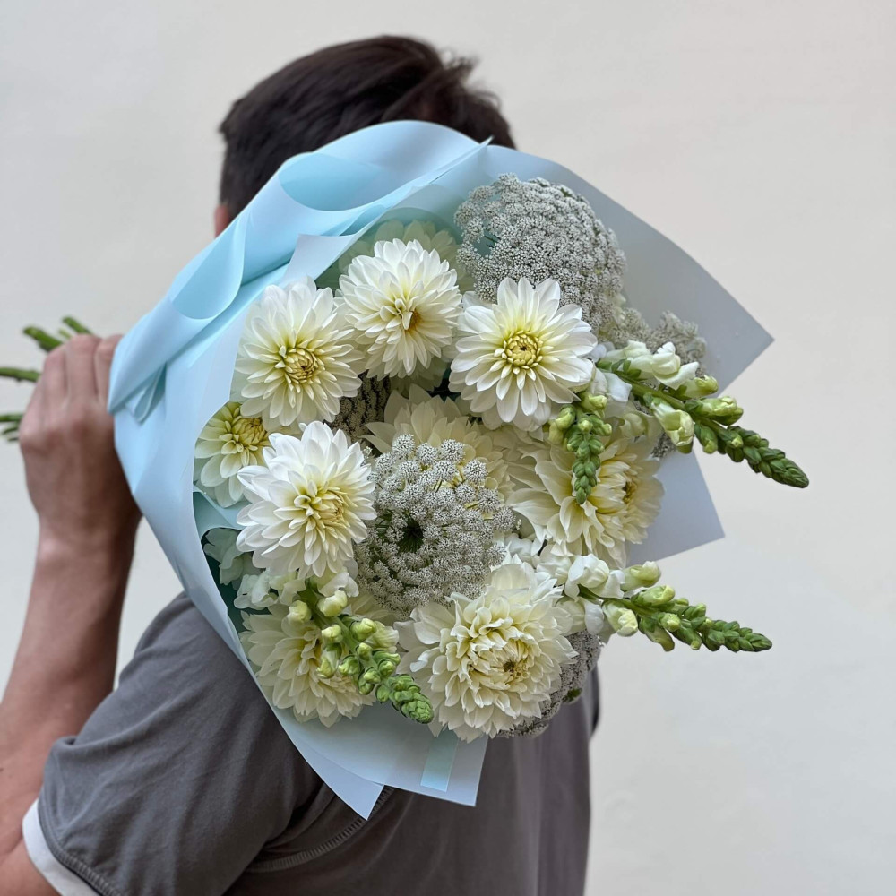 - Як замовити Світлий букет з жоржинами «Перлинове мереживо»? ❯