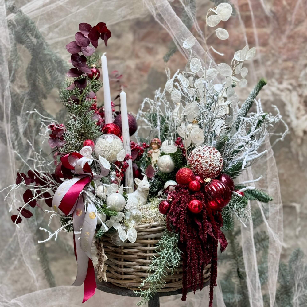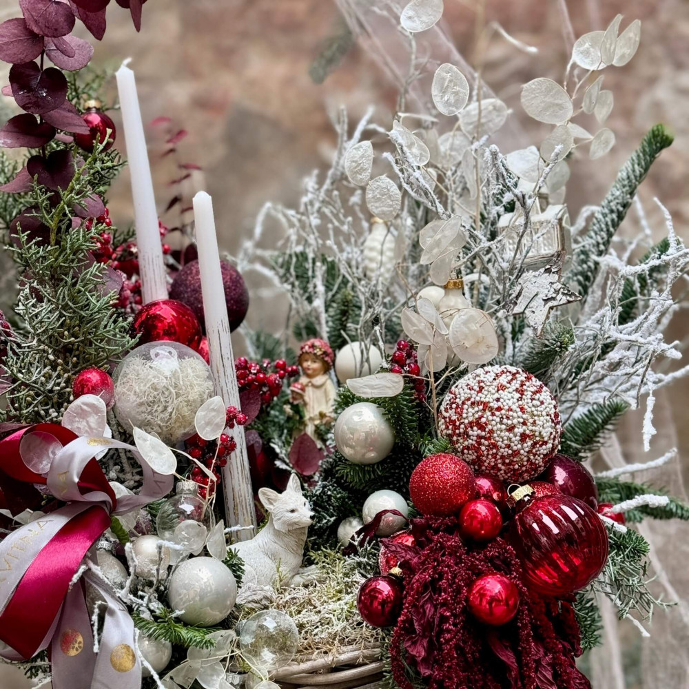 Квіти: Нобіліс (ялинка), Амарант хвостатий, Лунарія, Евкаліпт, Кипарис, Чорничник, Кульки, Керамічні іграшки, Свічки