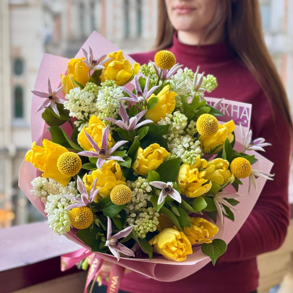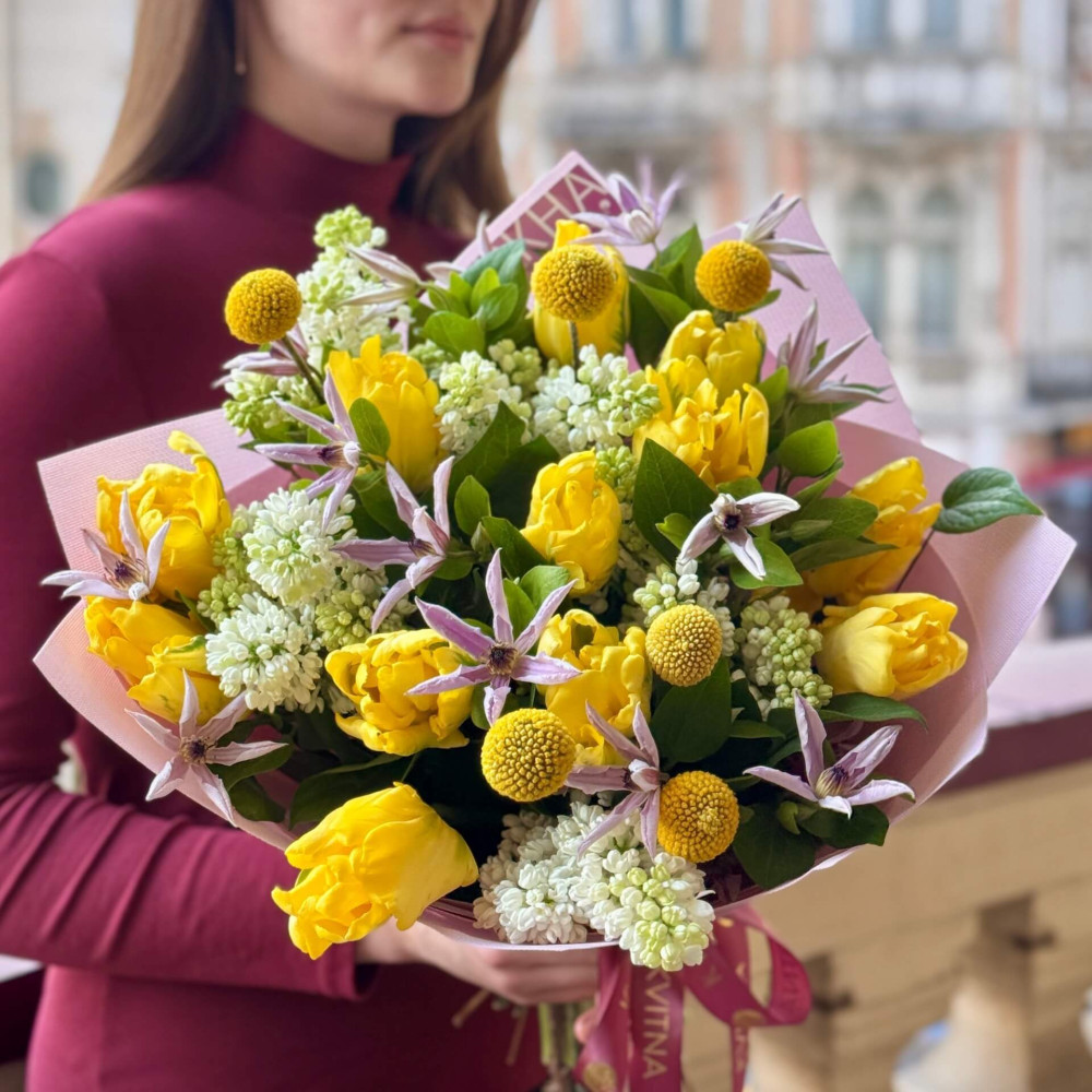 - Як замовити Сяючий весняний букет з бузком, тюльпанами та клематісом «Зорі навесні»? ❯