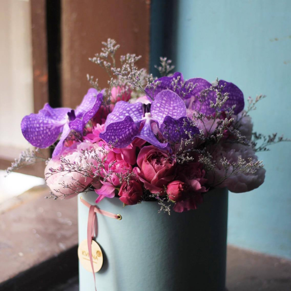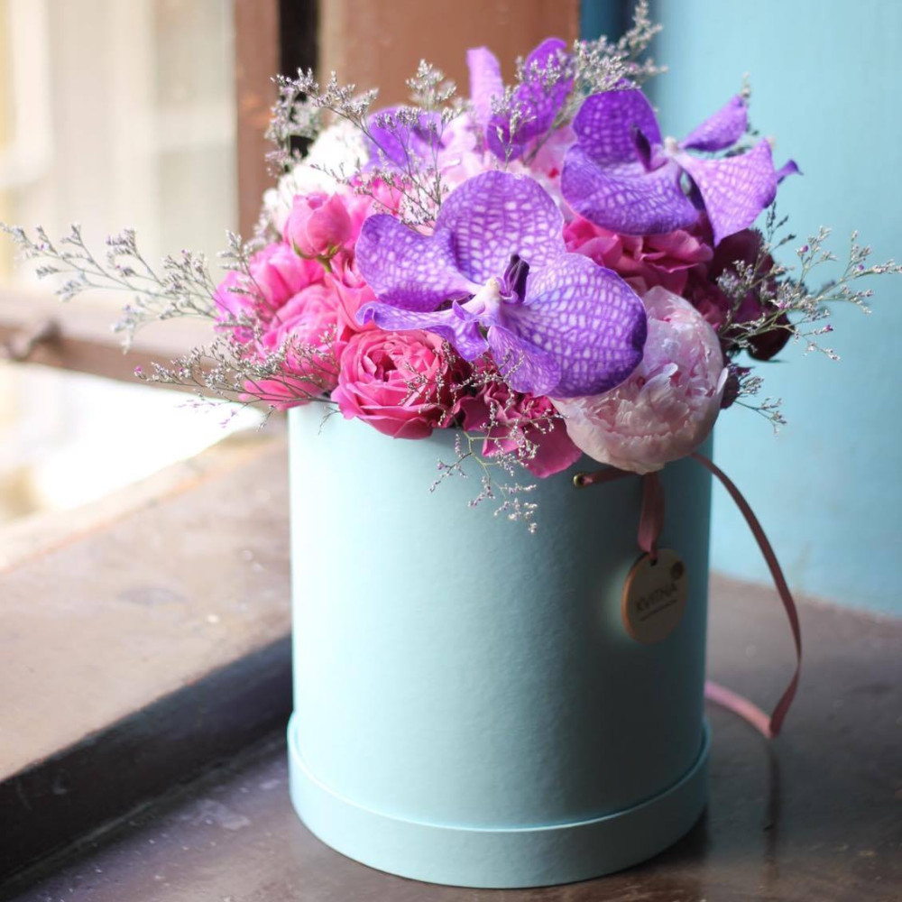 - Як замовити Тендітна композиція з фаленопсисом Ванда в шляпній коробці? ❯