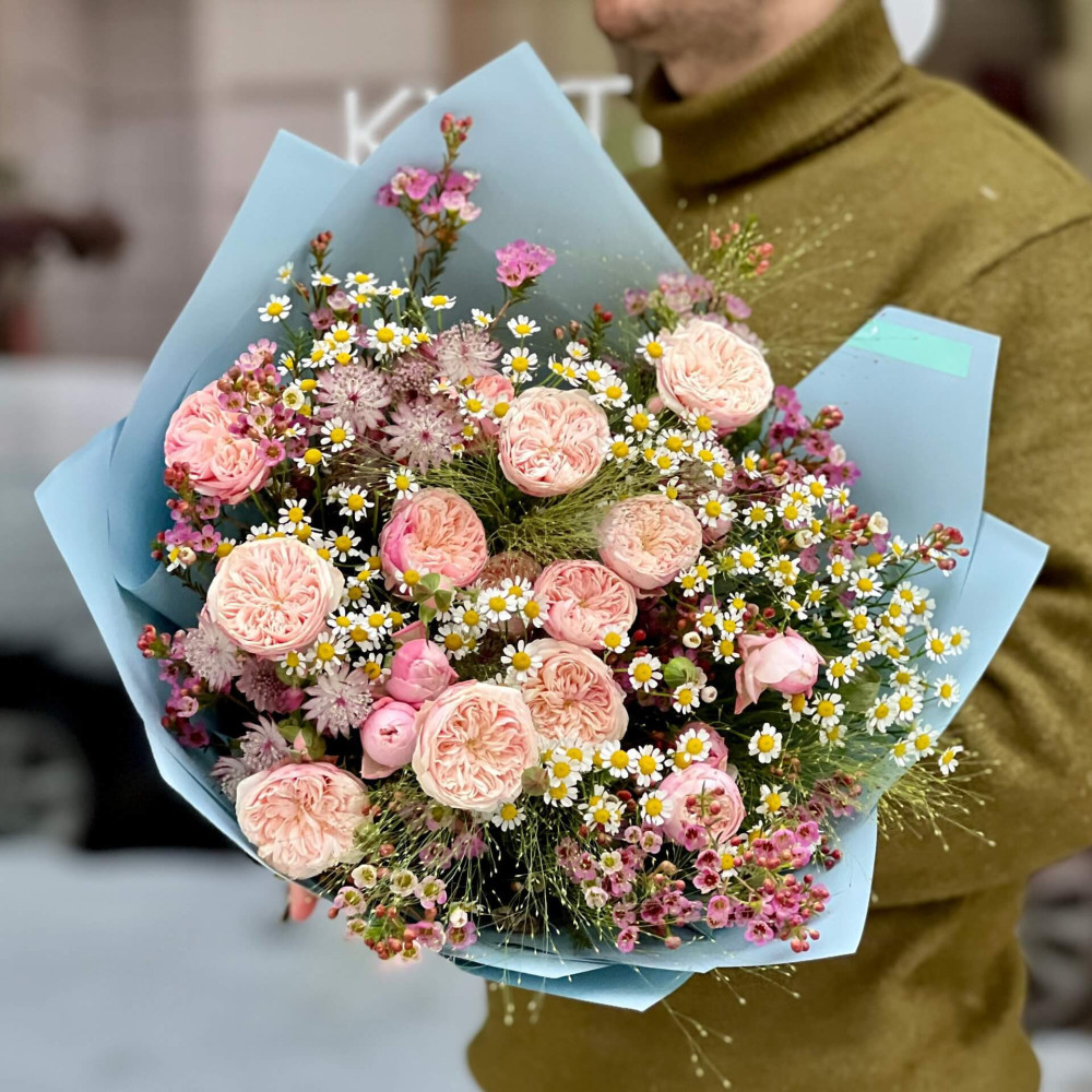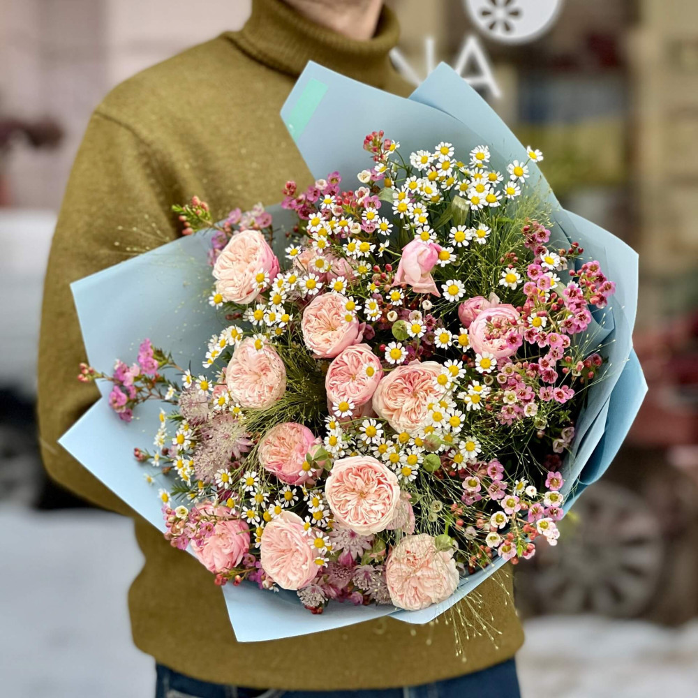 Легкі мов хмаринка квіточки хамелауціуму, танацетуму чудово поєднуються з кущовими піоновидними трояндами, створюючи хмаринку квітів, немов найніжніший поцілунок, який летить до тебе.