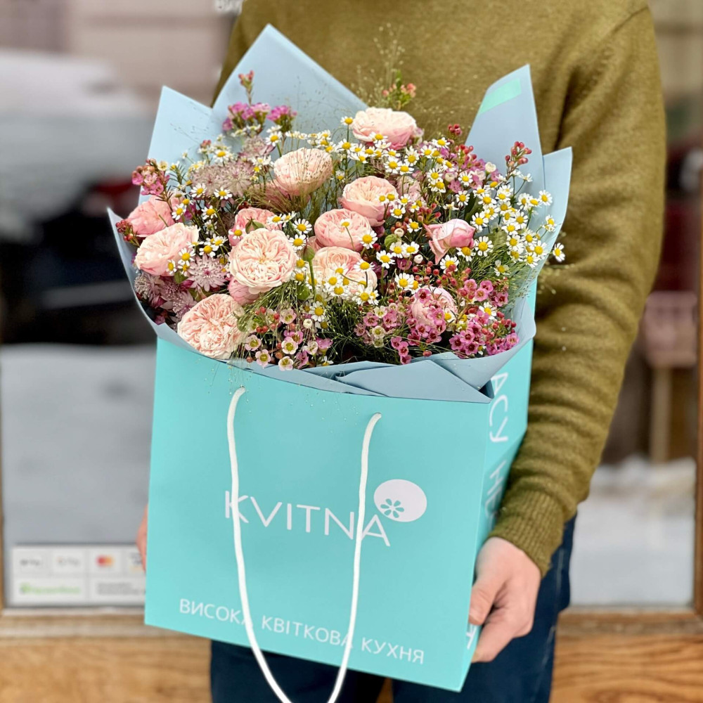 - Букети від Kvitna доставляються у фірмовому пакуванні, яке потрібно зняти при установці квітів у вазу. Не зрізайте стрічку, звʼязуючу букет, щоб зберегти його форму.