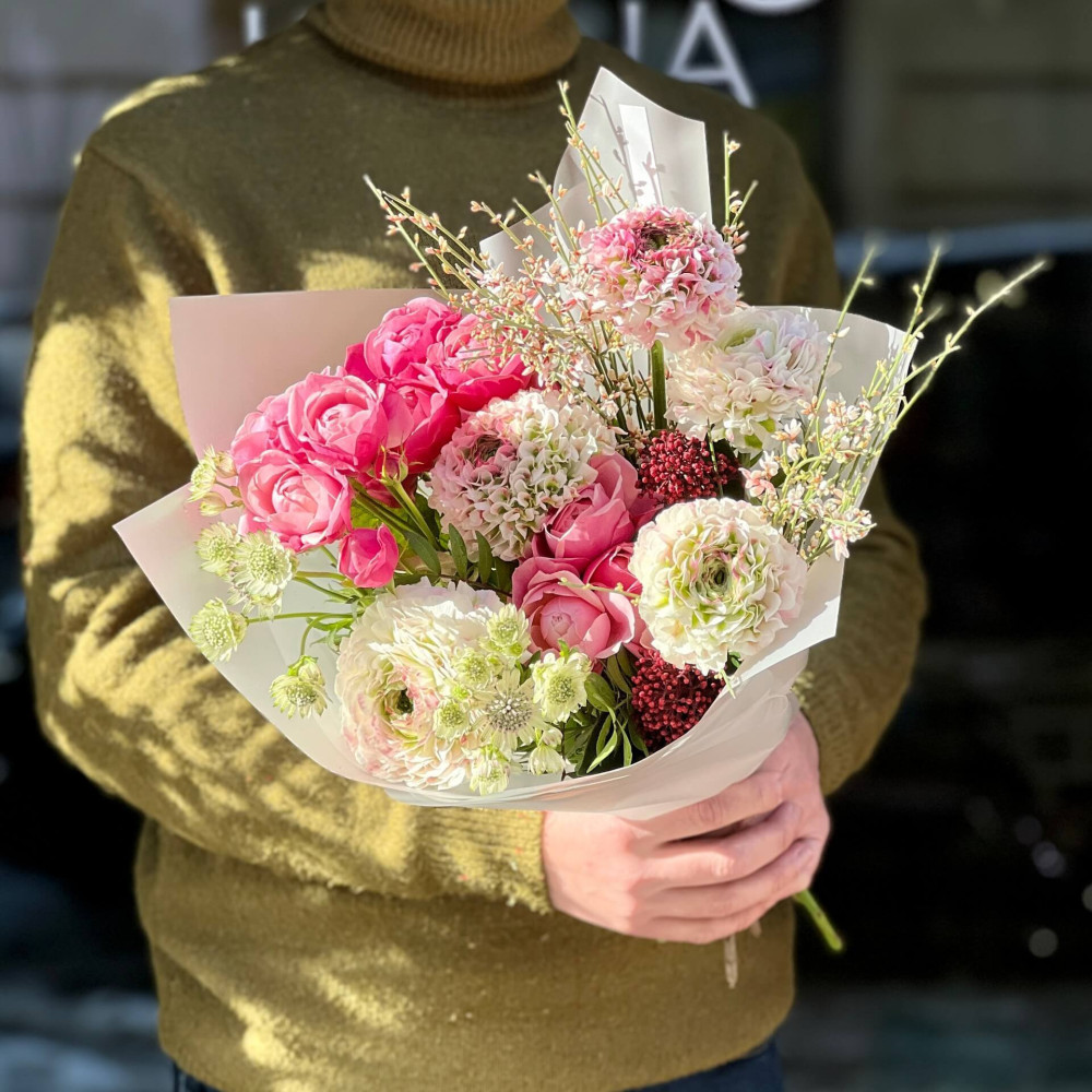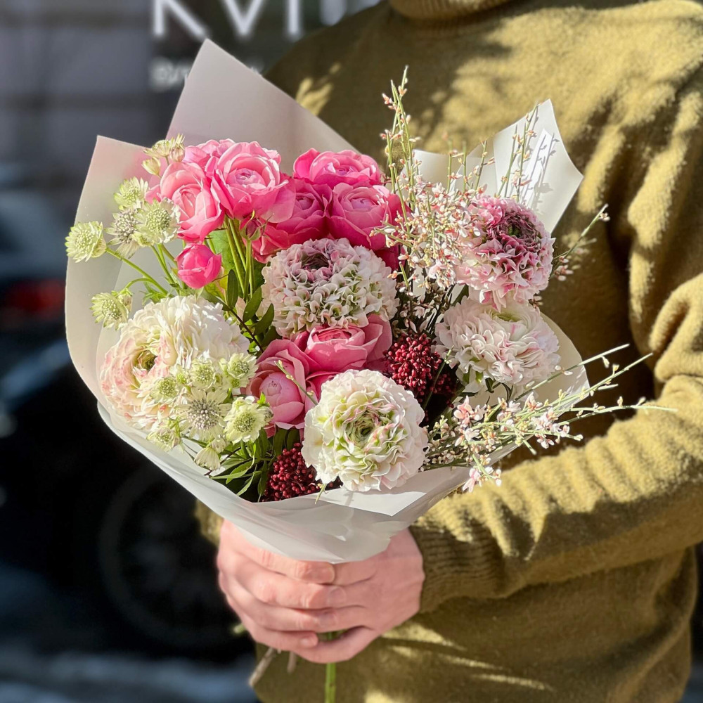 Квіти: Ранункулюс, Троянда піоновидна кущова, Геніста, Астранція, Скімія