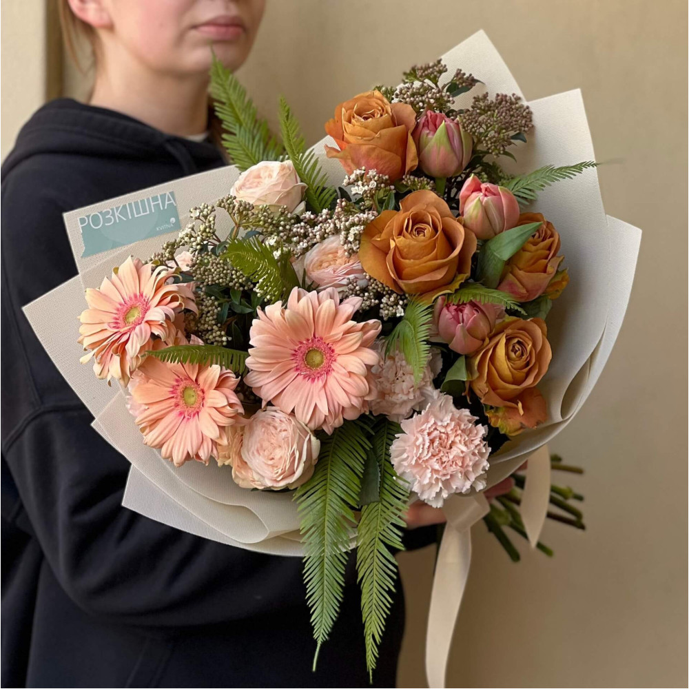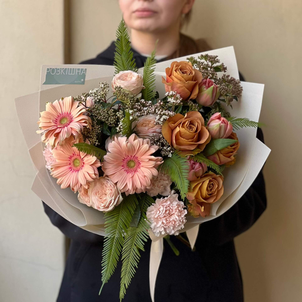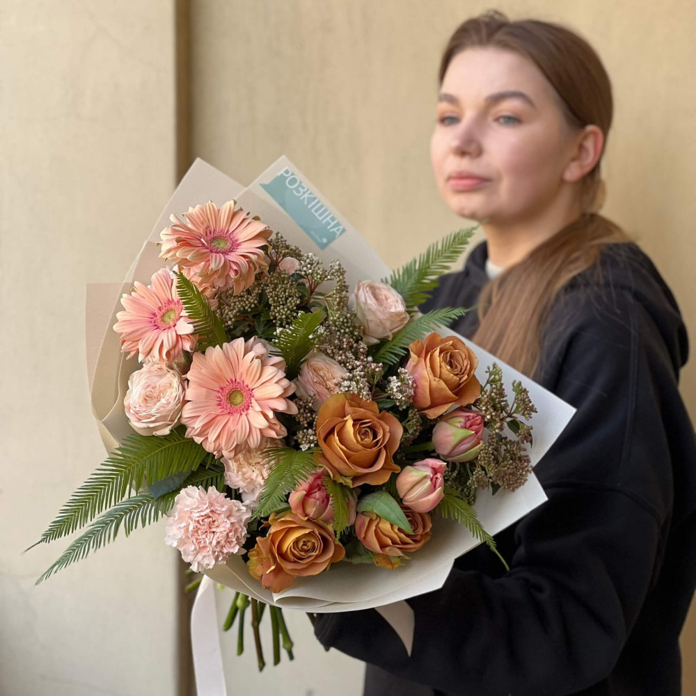 - Як замовити Теплий букет з герберою Pasta Rosata та піоновидною трояндою Symbol «Затишний садок»? ❯