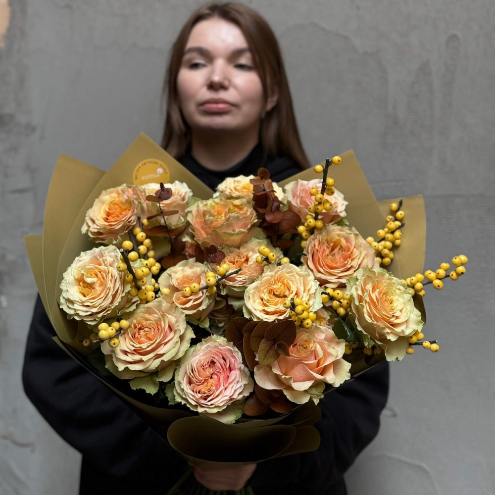 Квіти: Троянда піоновидна - 17 шт., Ілекс, Евкаліпт