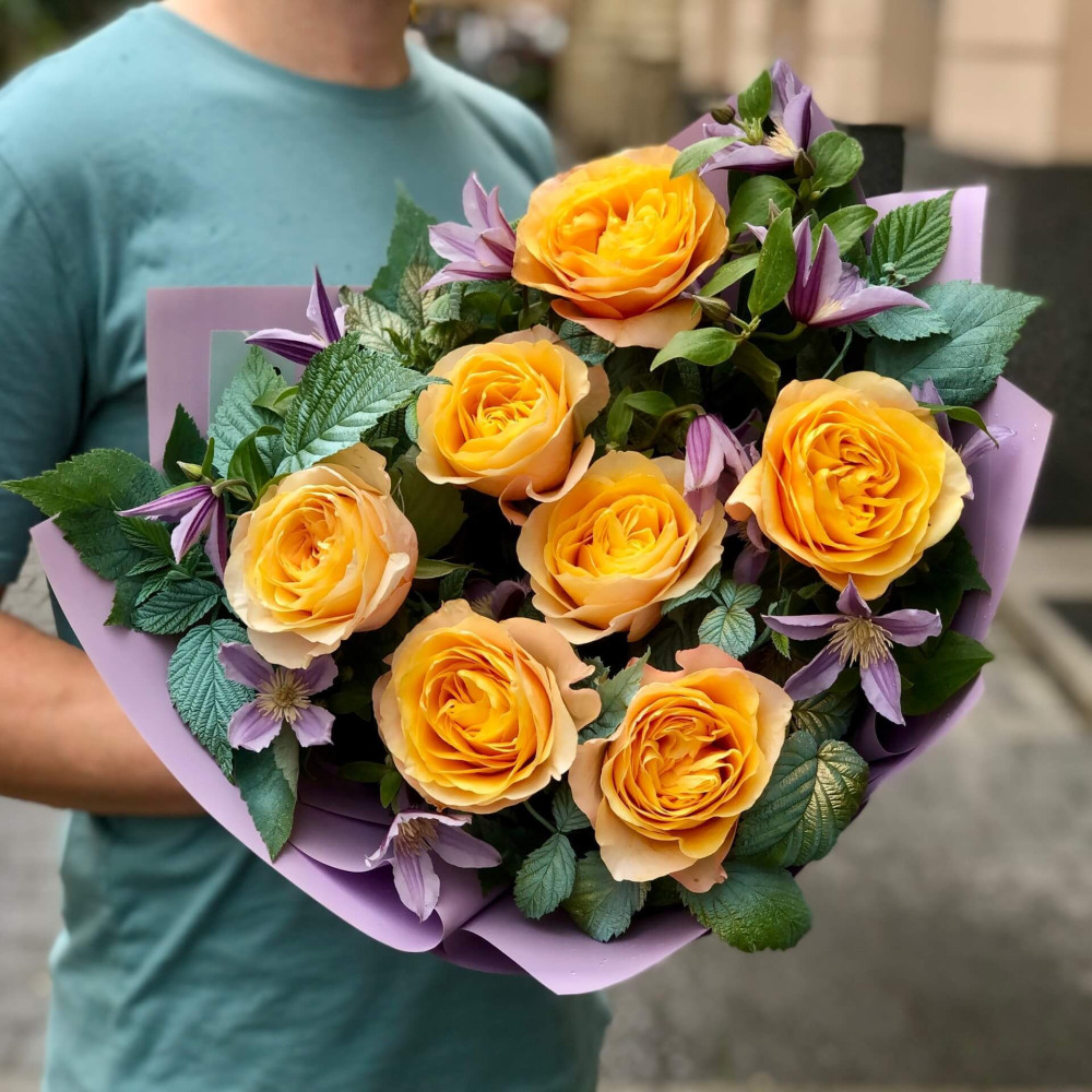Квіти: Троянда піоновидна, Малина (листя), Клематіс