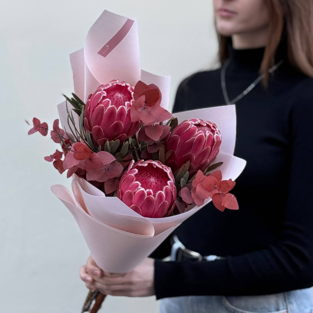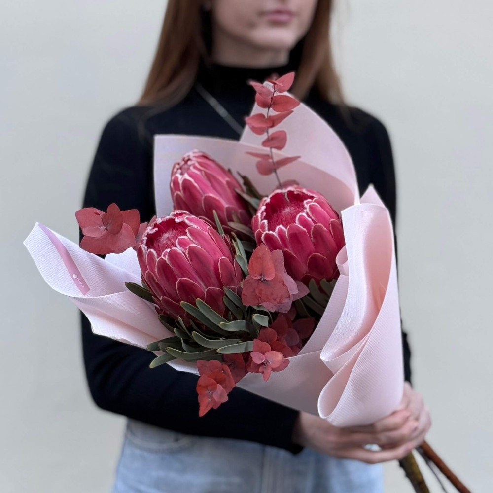 - Як замовити Три екзотичні протеї Sylvia в букеті «Рубіновий атлас»? ❯