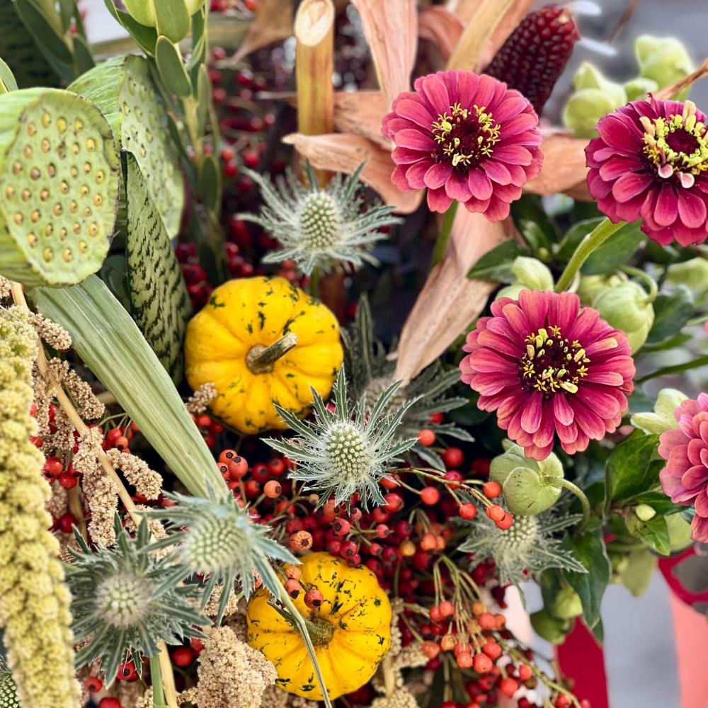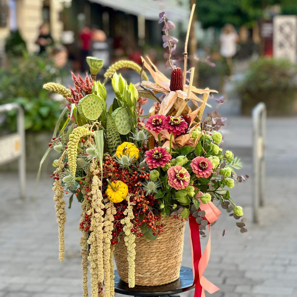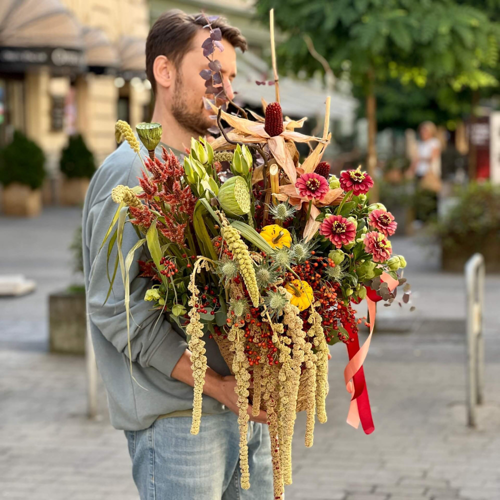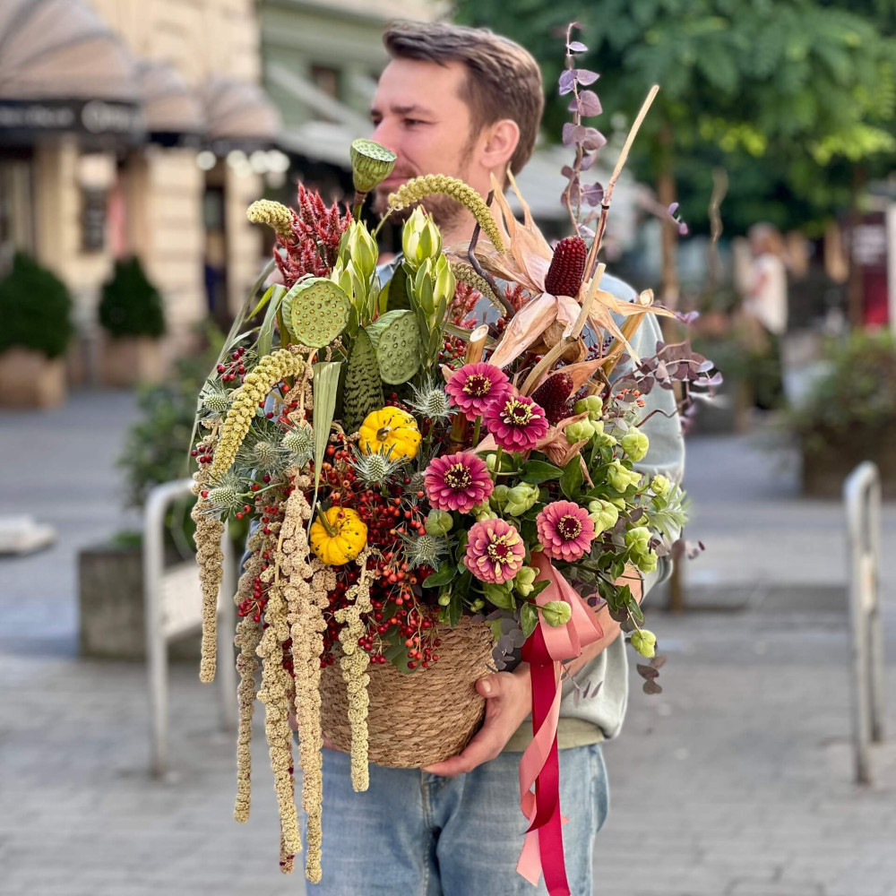 Квіти: Шипшина, Хелеборус, Ерінгіум, Сетарія, Амарант хвостатий, Нелюмбо, Цинія, Леукадендрон, Евкаліпт, Кукурудза, Гарбуз