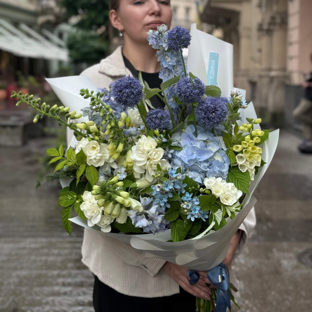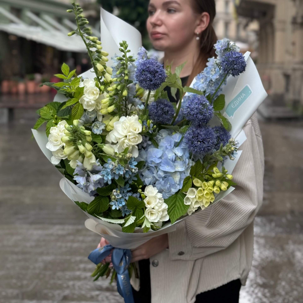 Квіти: Фрезія, Дельфініум, Алліум, Гортензія, Оксіпеталум, Малина (листя)
