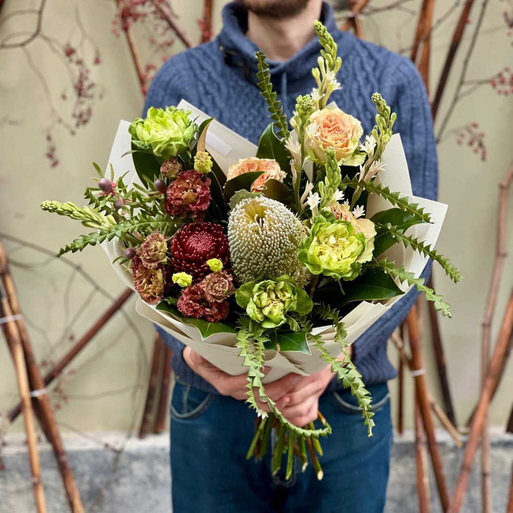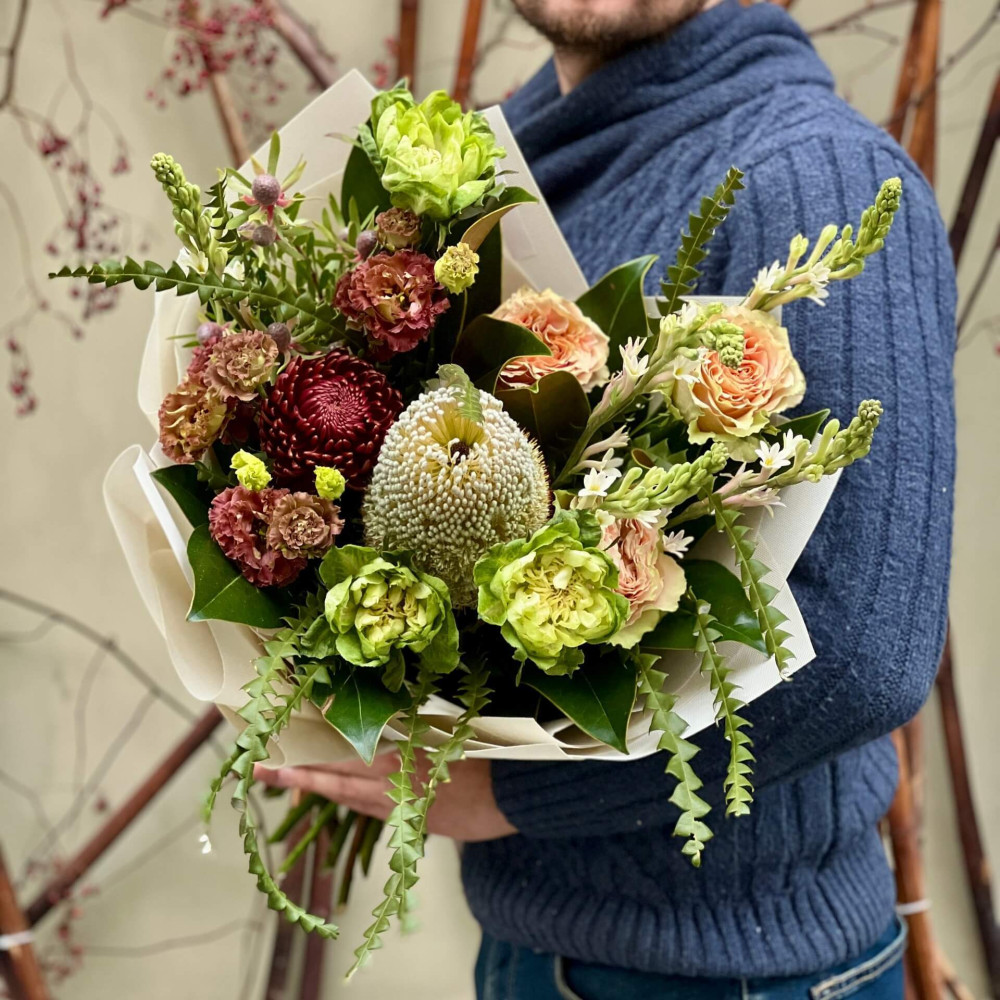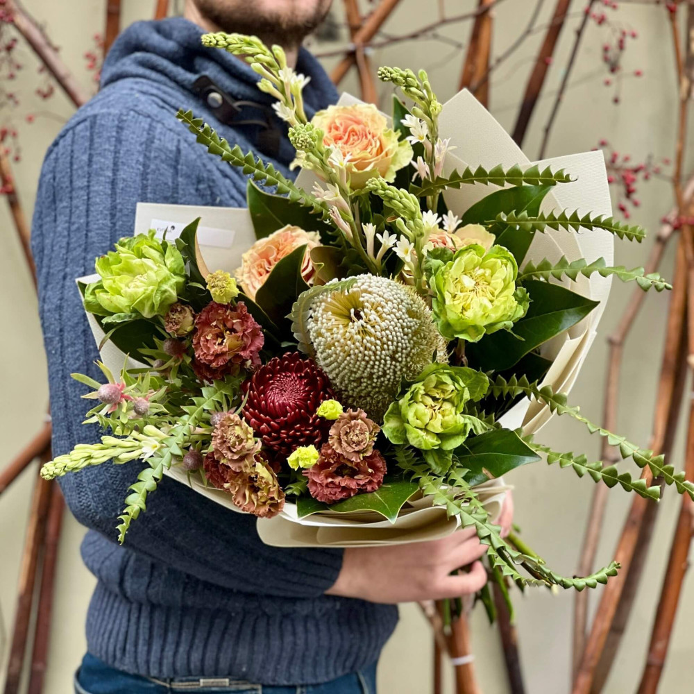 Квіти: Банксія, Еустома, Троянда піоновидна, Хризантема, Тубероза, Магнолія, Леукадендрон