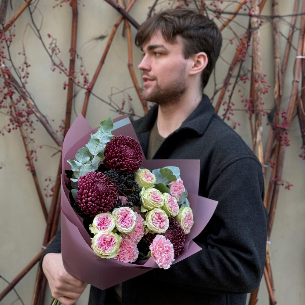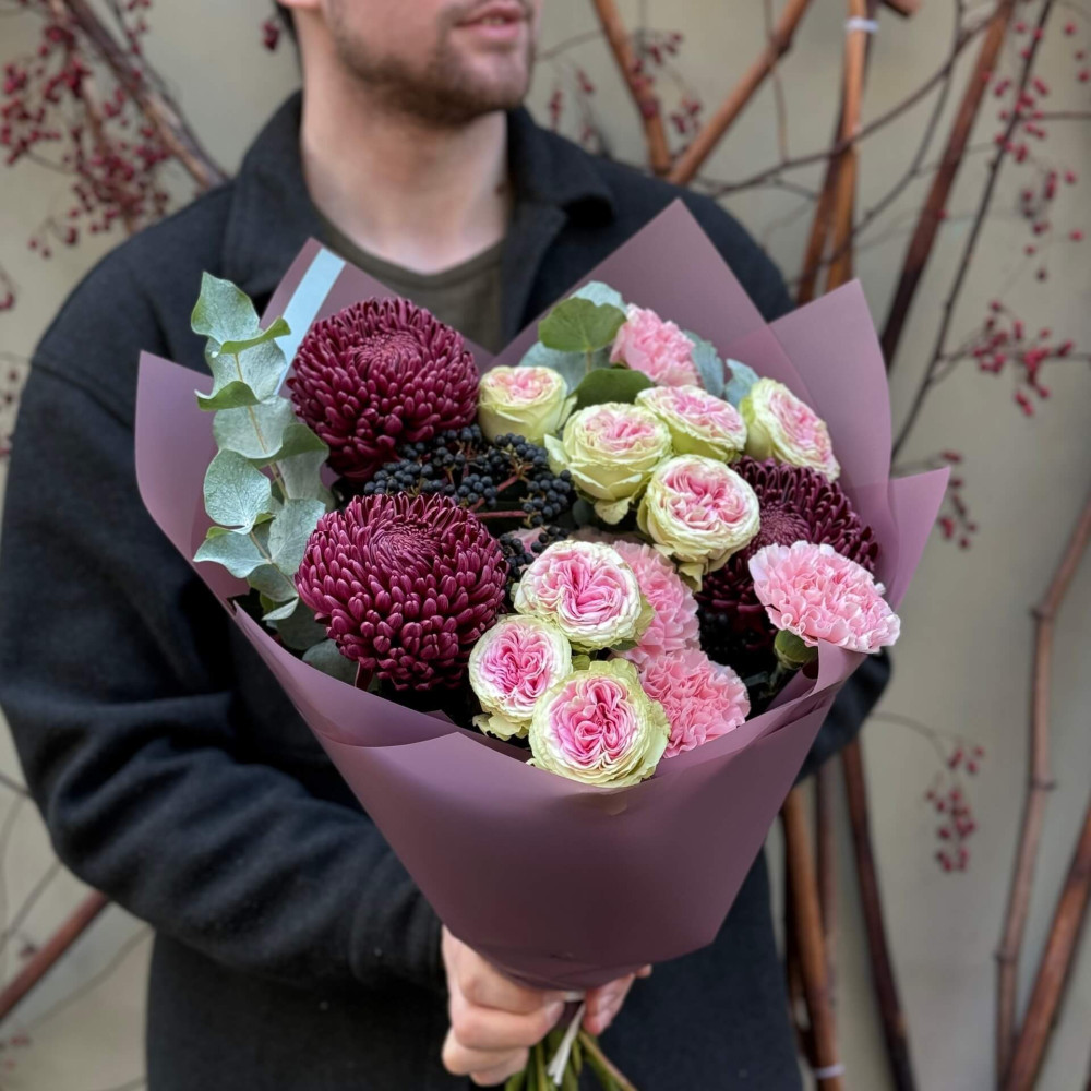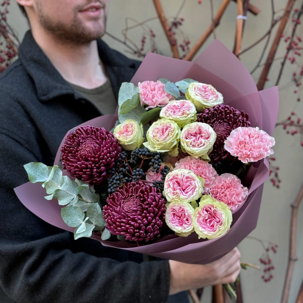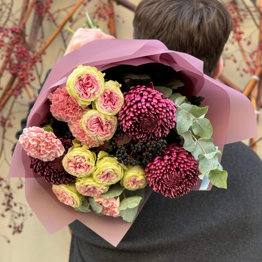 Квіти: Тюльпан піоновидний, Евкаліпт, Хамелаціум, Троянда піоновидна кущова, Хризантема сорту Bigoudi, Вібурнум (ягоди), Діантус (Гвоздика)