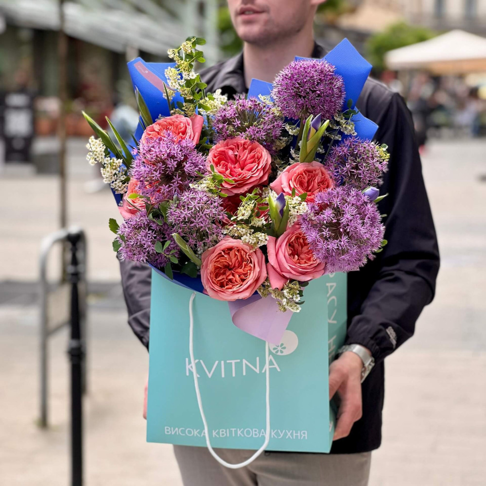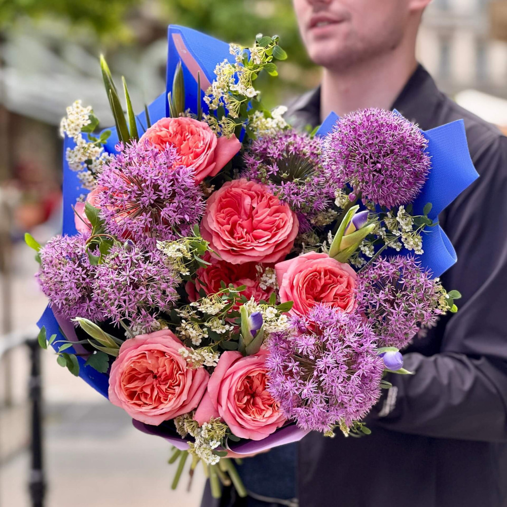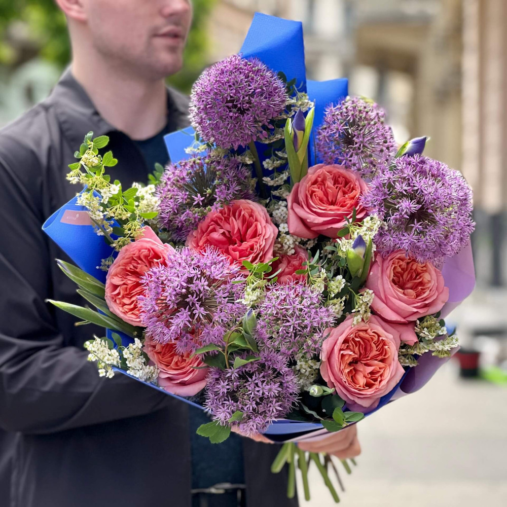 - Як замовити Цікавий букет з піоновидними трояндами та алліумом «Фіолетовий захід»? ❯