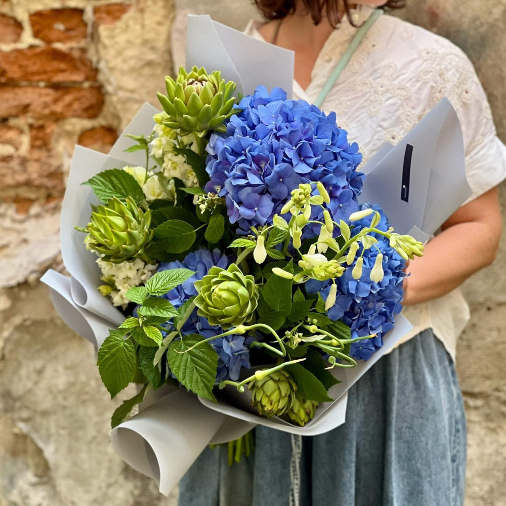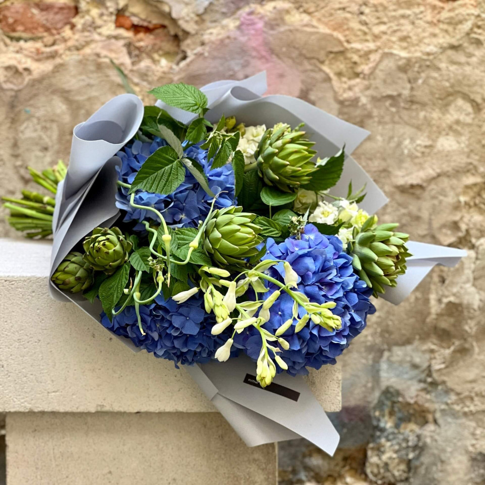 - Як замовити Цікавий букет з цинарою та гортензією «Літнє небо»? ❯