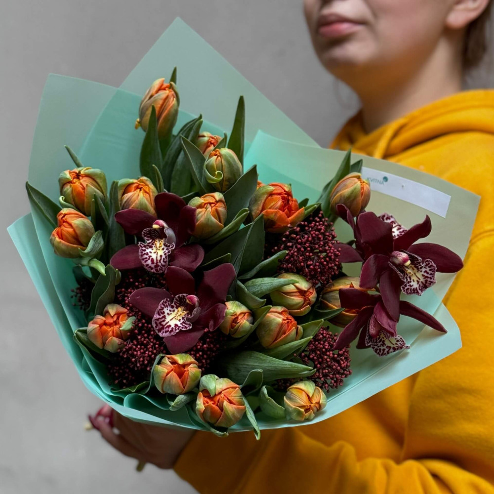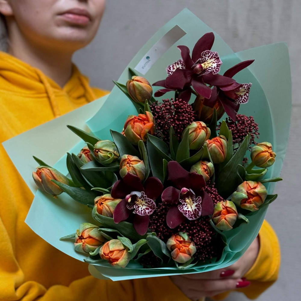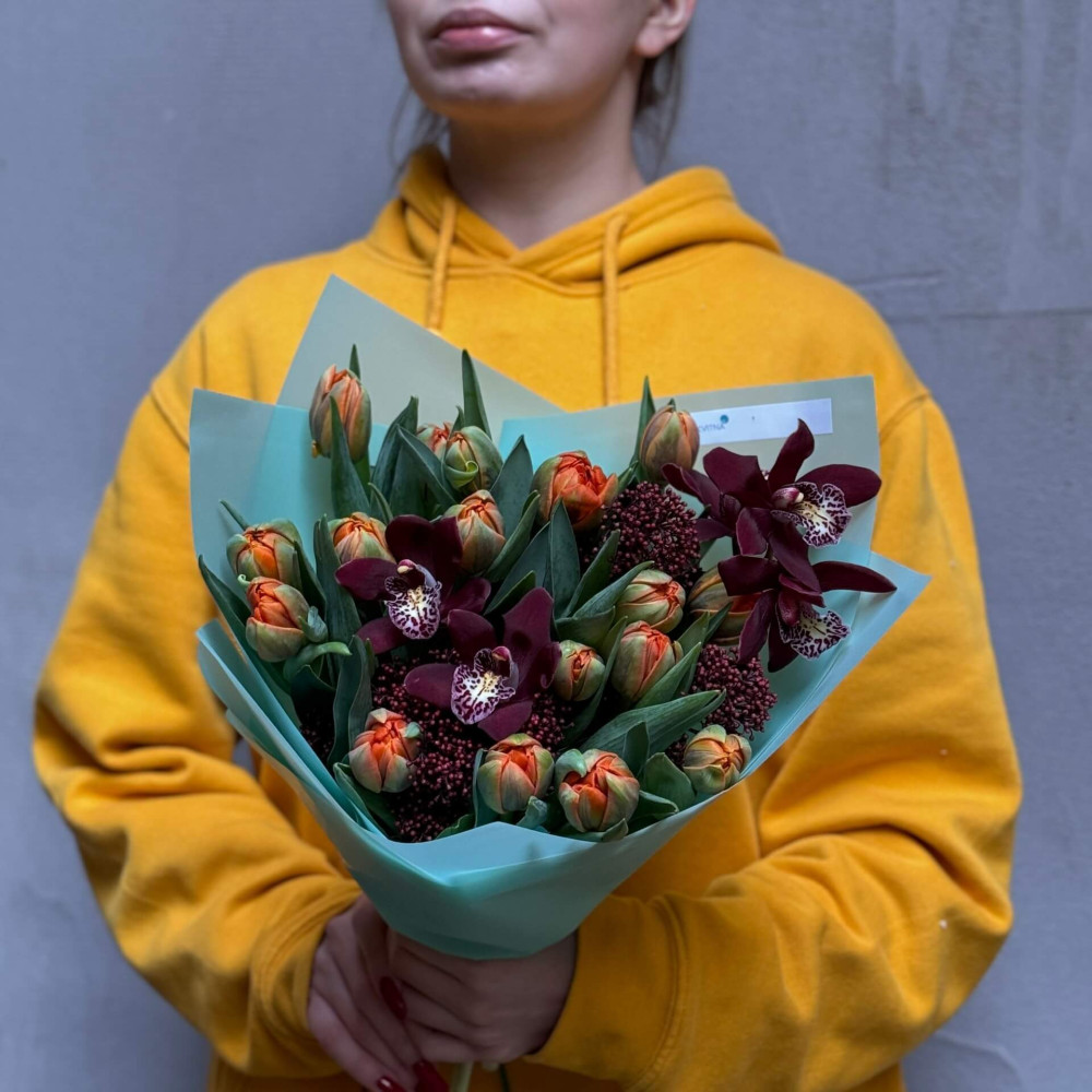 - Як замовити Цікавий букет з тюльпанами та цимбідіумом «Осіння квіточка»? ❯
