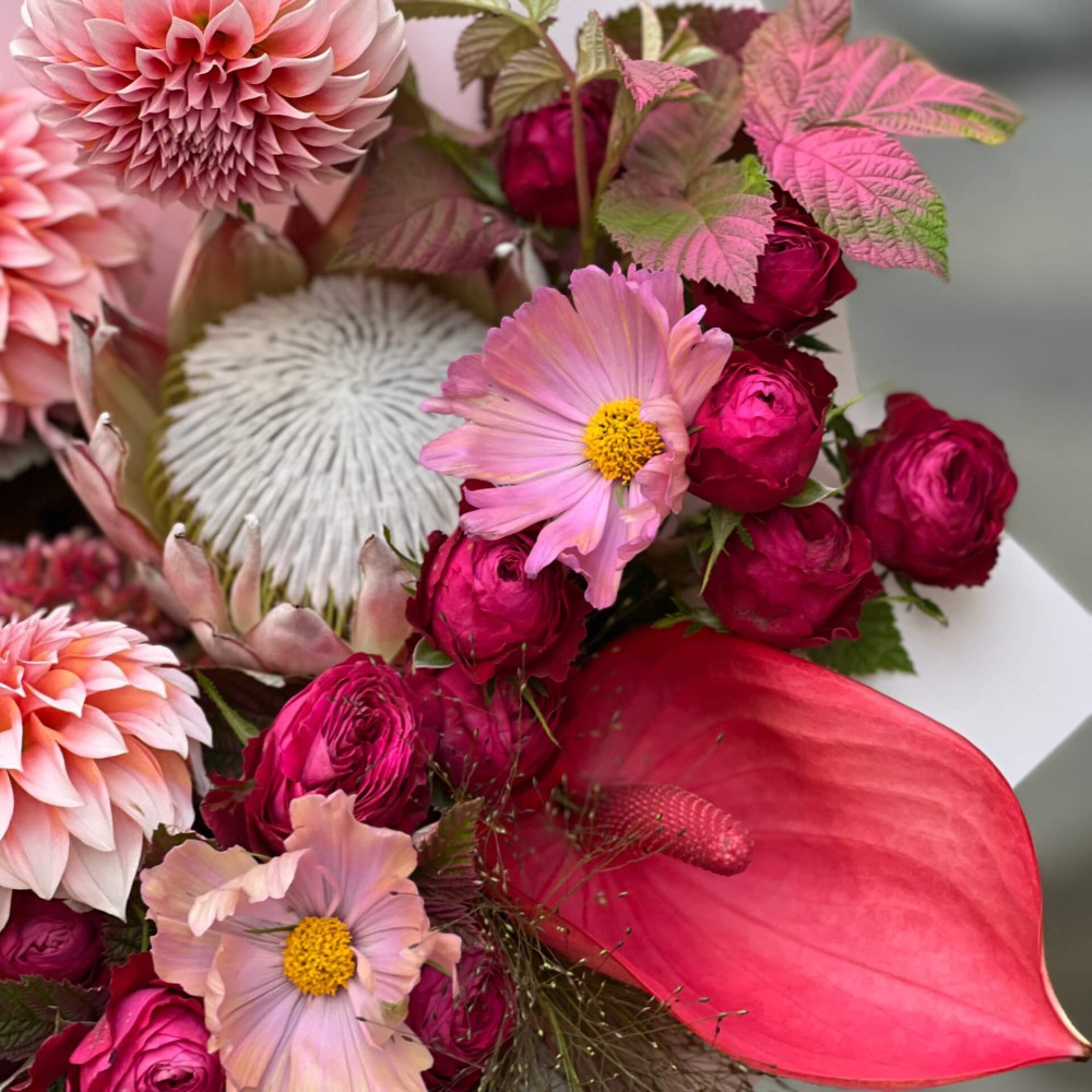 Квіти: Гладіолус, Малина (листя), Космея, Панікум, Протея, Цинія, Троянда піоновидна кущова, Жоржина, Антуріум