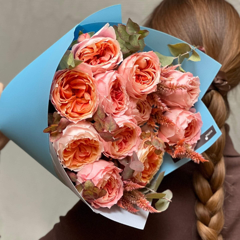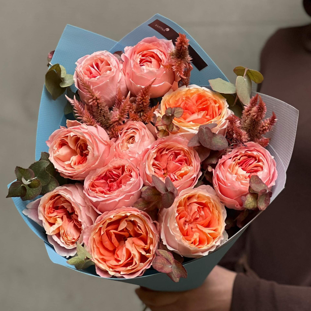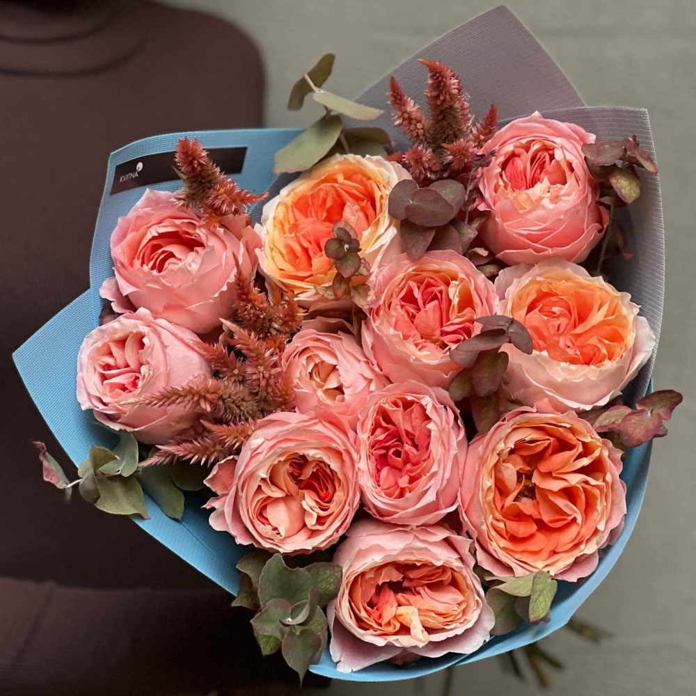 Квіти: Целозія, Евкаліпт, Троянда піоновидна сорту Princess Sakura