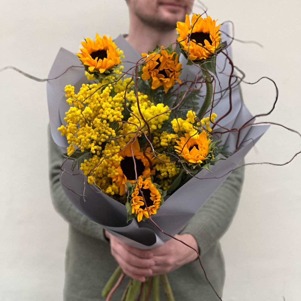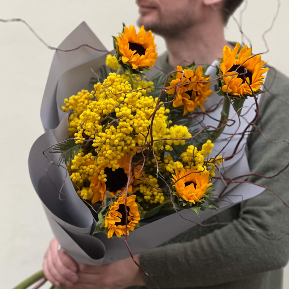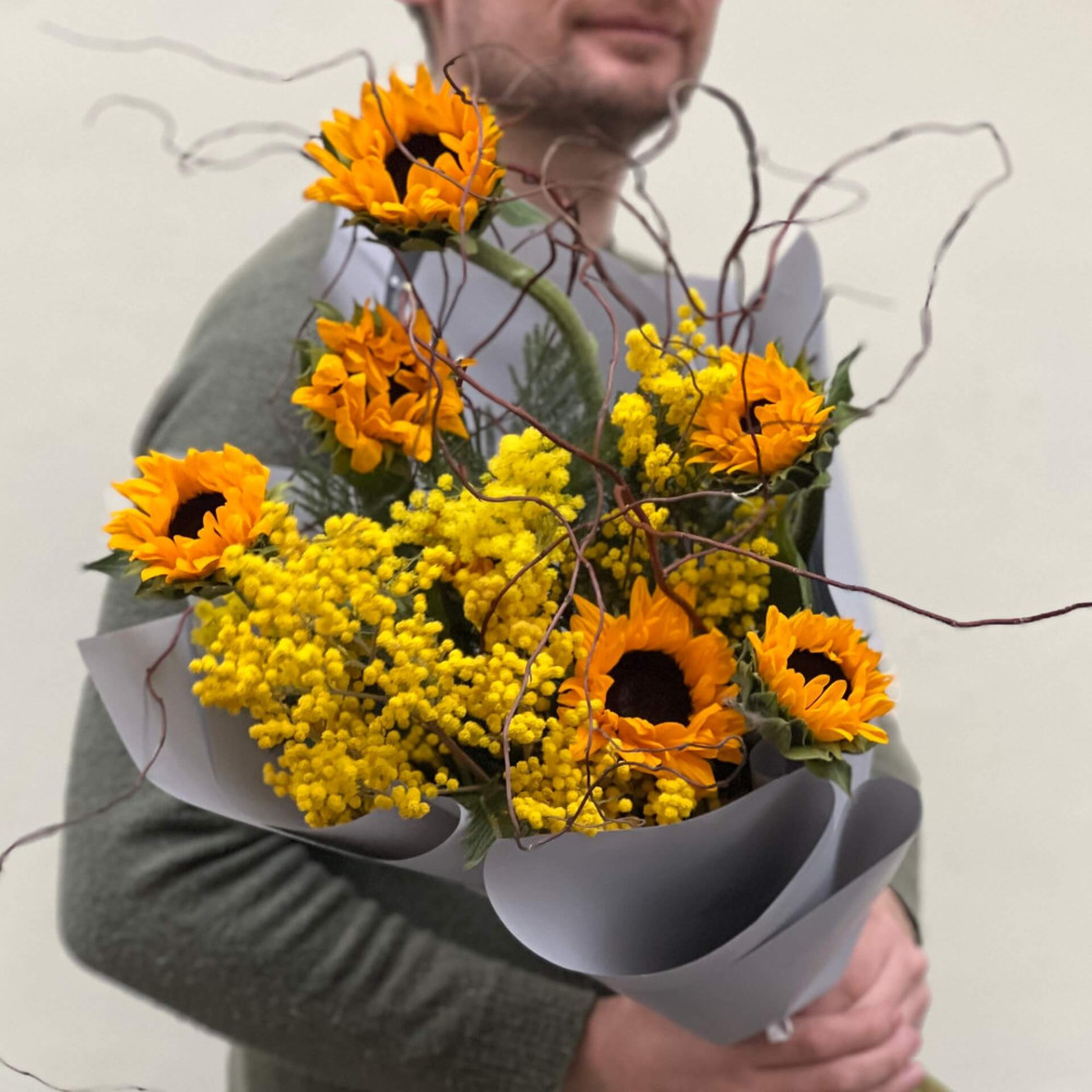 - Як замовити Цікавий букет із соняшниками та мімозою «Зачароване сонце»? ❯