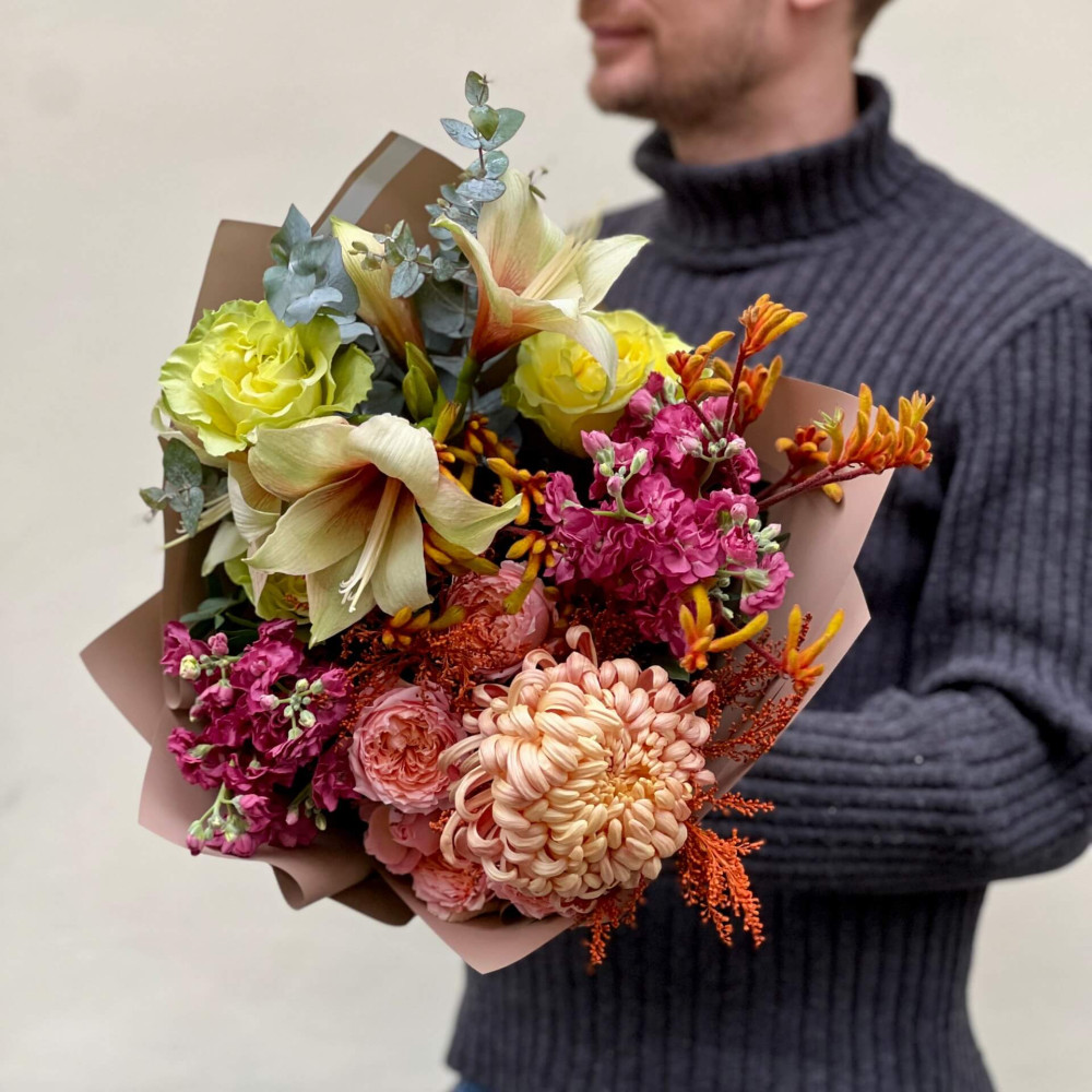 - Як замовити Цікавий букет з амарилісом та хризантемою «Відголоски осені»? ❯