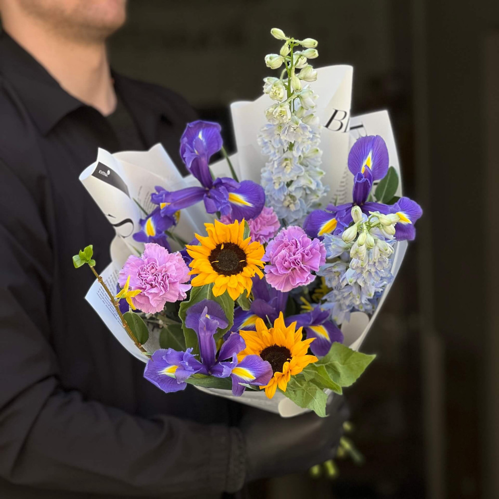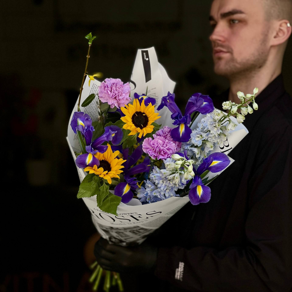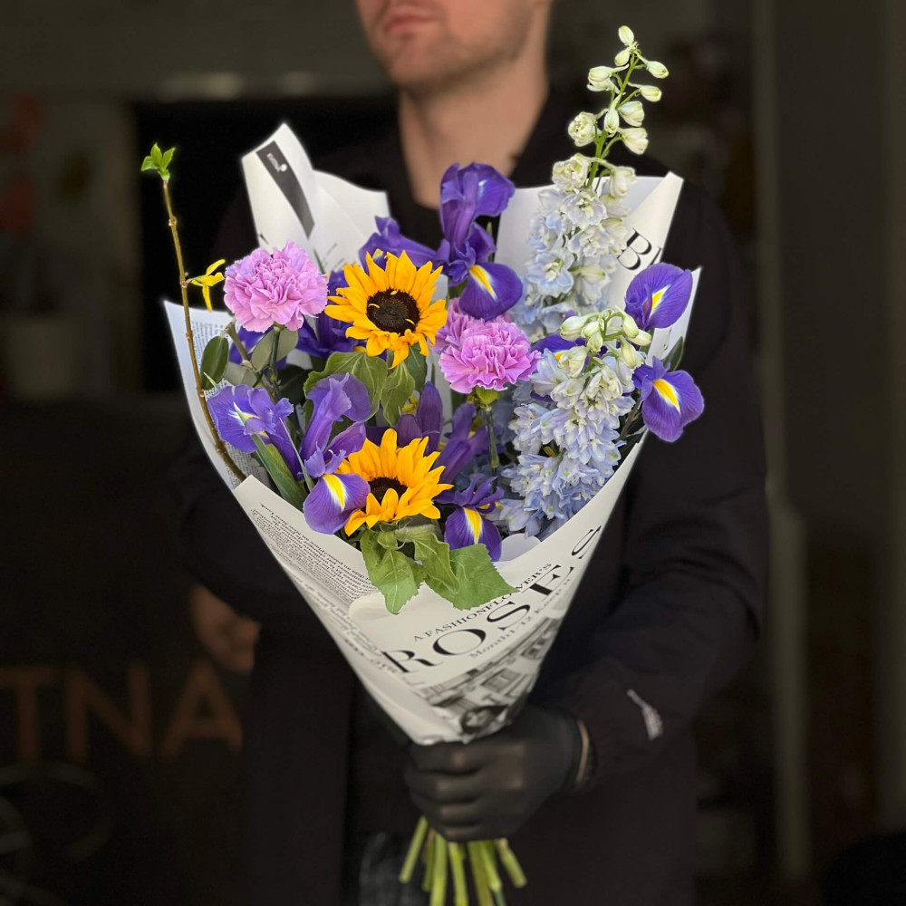 - Як замовити Цікавий букет з ірисами та соняшниками «Весняна пісня»? ❯