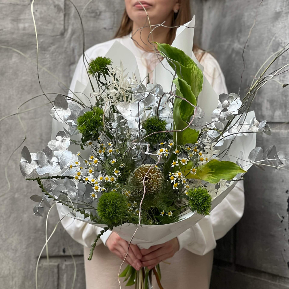 - Як замовити Цікавий букет з каллами та банксією «Холодна екзотика»? ❯