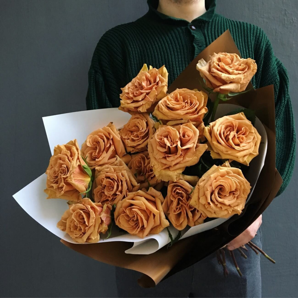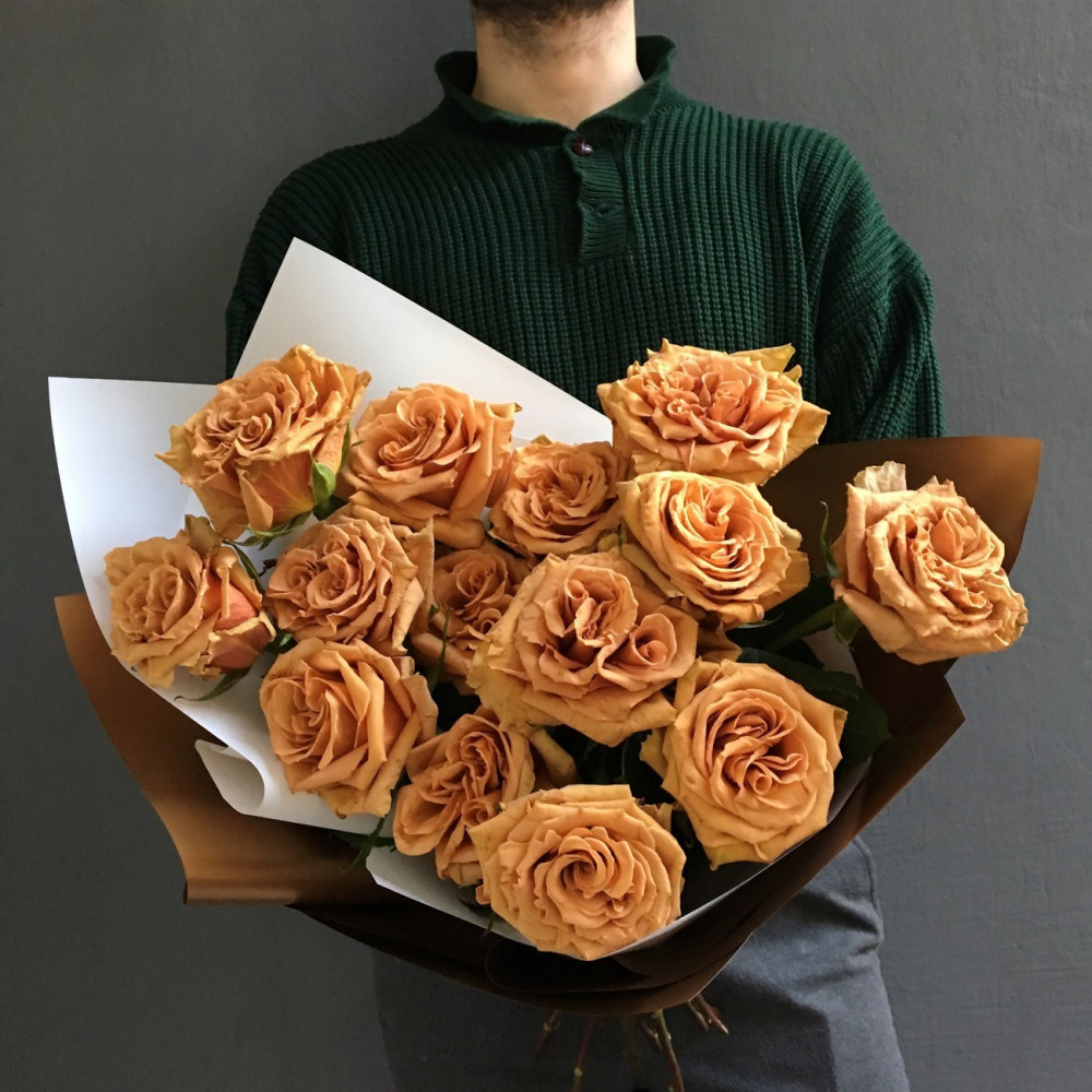 Букет з 15 коричневих, золотистих троянд. Троянда дивує своїм кольором та розкриттям бутону, для тих хто любить найсолодші квіти.