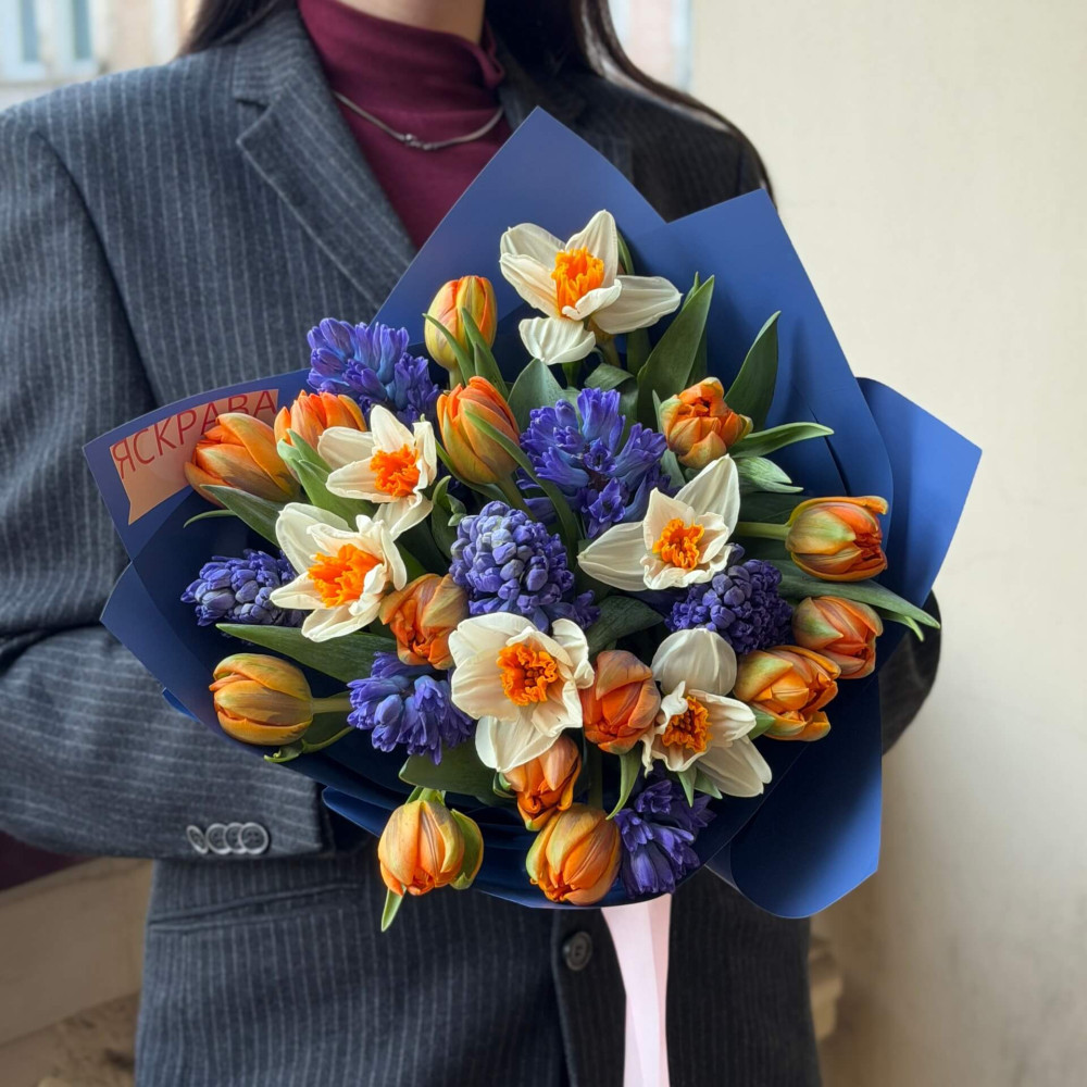 Весняний запашний букет з гіацинтами, тюльпанами і нарцисами «Казкові первоцвіти»