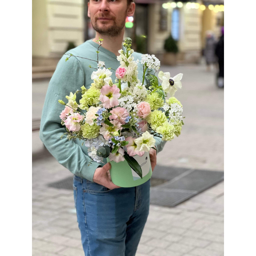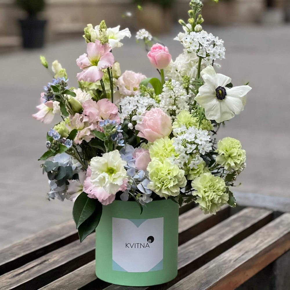 Нехай композиція (коробка, кошик, сніп) з квітами від Квітна тішить Вас якнайдовше!