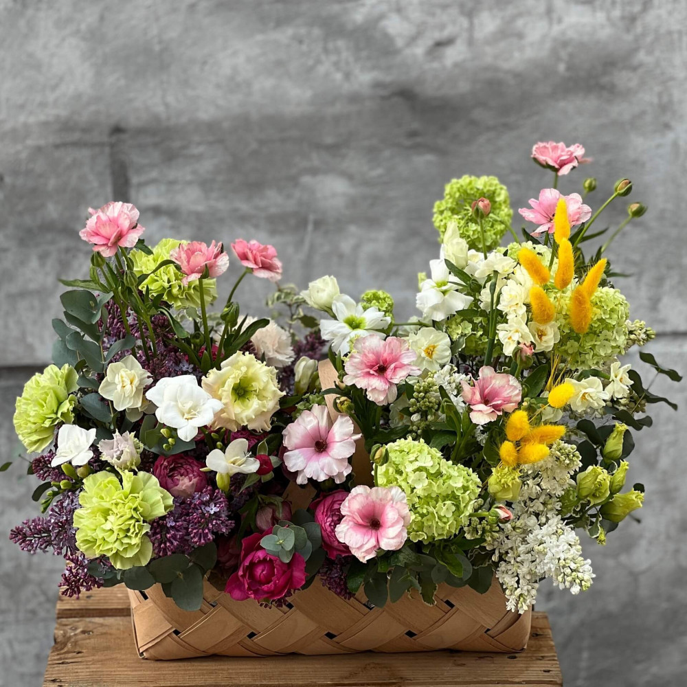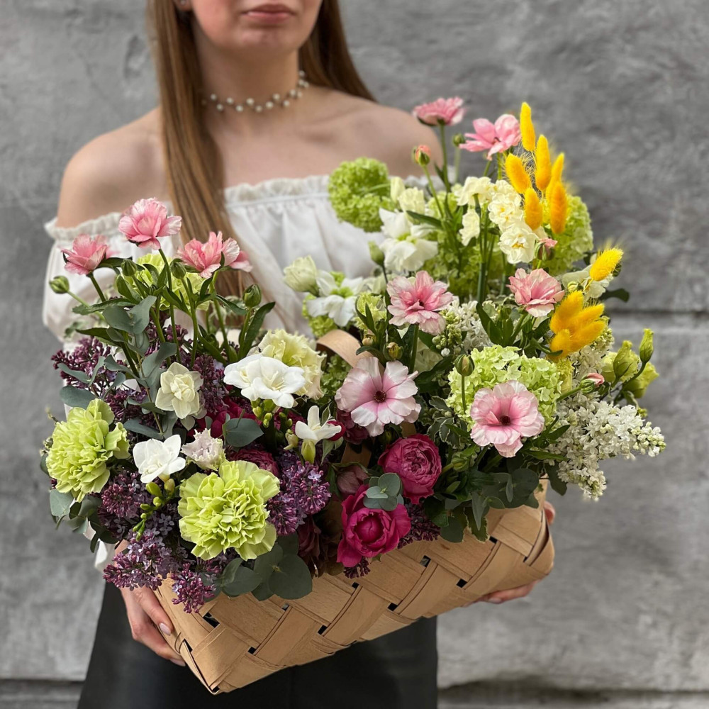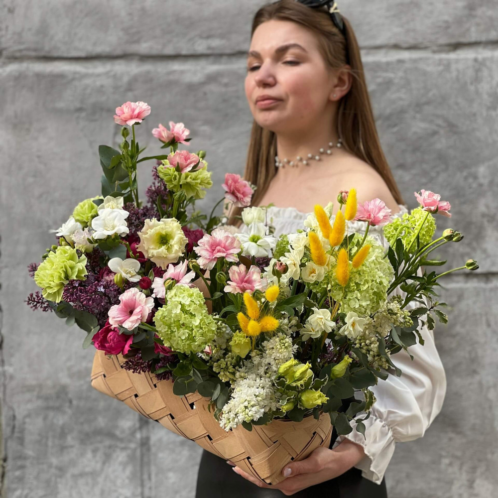 Квіти: Вібурнум, Бузок, Діантус (Гвоздика), Піттоспорум, Ранункулюс, Нарцис, Еустома, Соняшник, Троянда, Евкаліпт, Лагурус, Фрезія