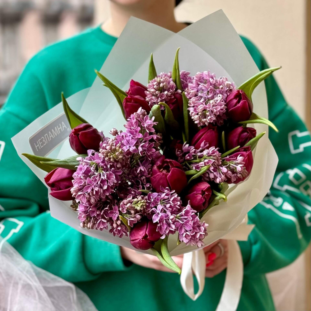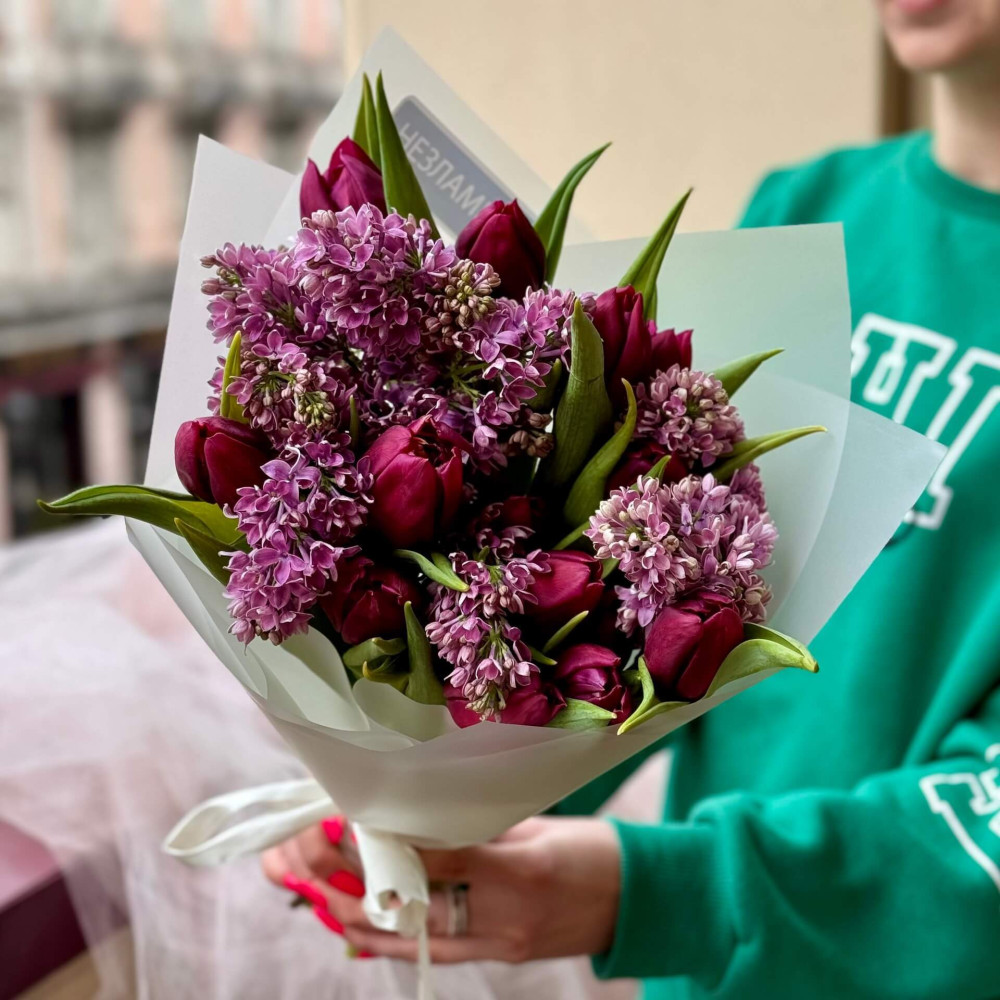 - Як замовити Весняний букет з бузку та тюльпанів «Фіолетова весна»? ❯