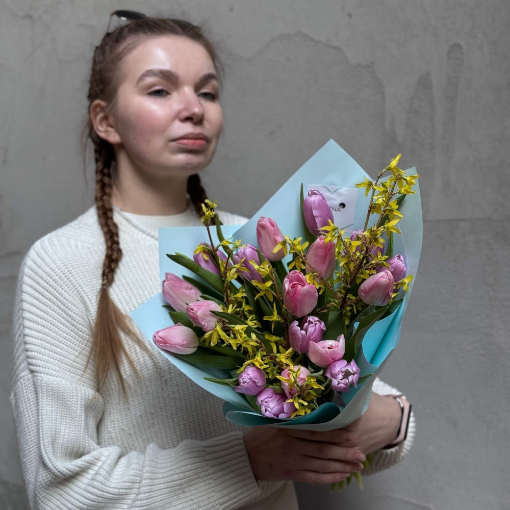 - Як замовити Весняний букет з гілочок форзиції та тюльпанів «Перші теплі промені»? ❯