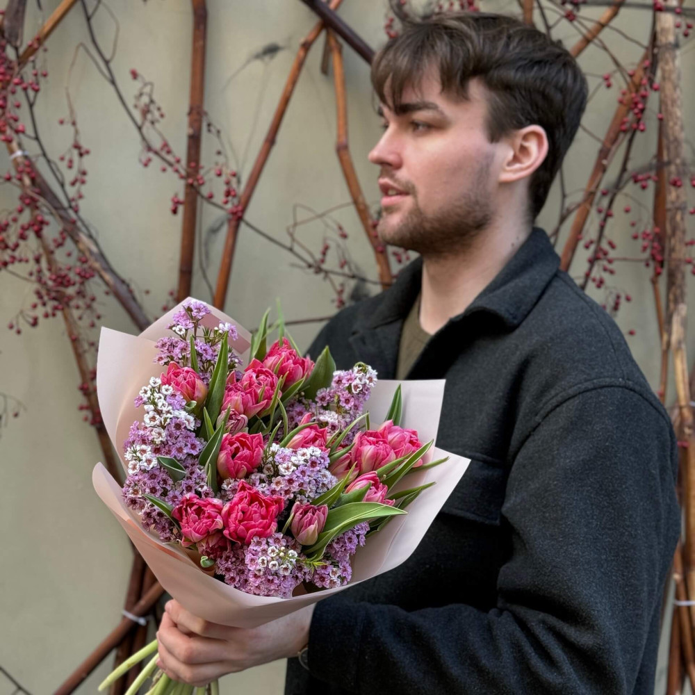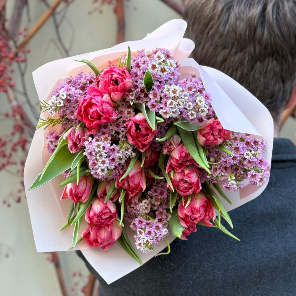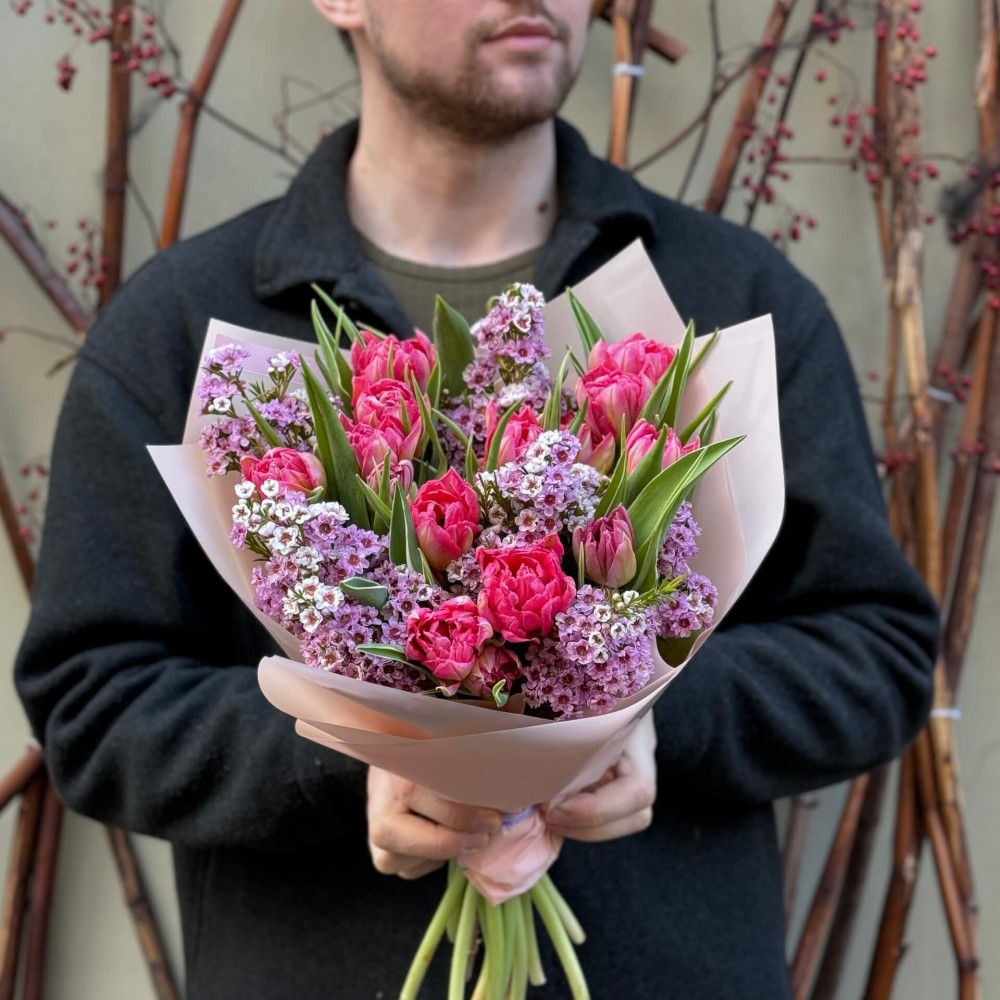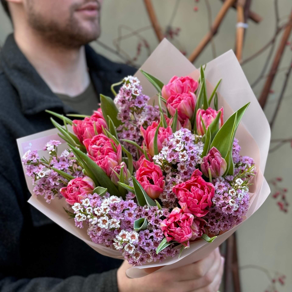 - Як замовити Весняний букетик з піоновидними тюльпанами та хамелаціумом «Солодкі примхи»? ❯