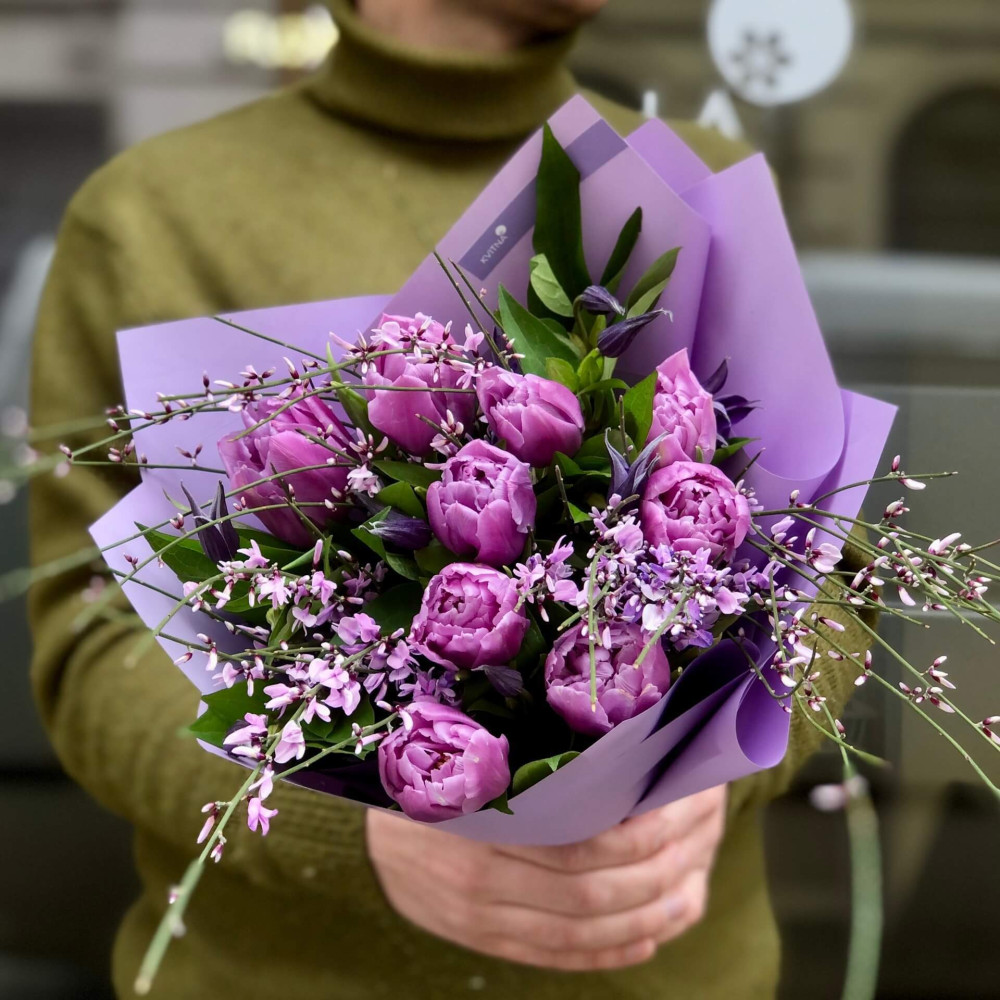 - Як замовити Весняний фіолетовий букет із тюльпанів, геністи та клематіса «Лавандовий струмочок»? ❯