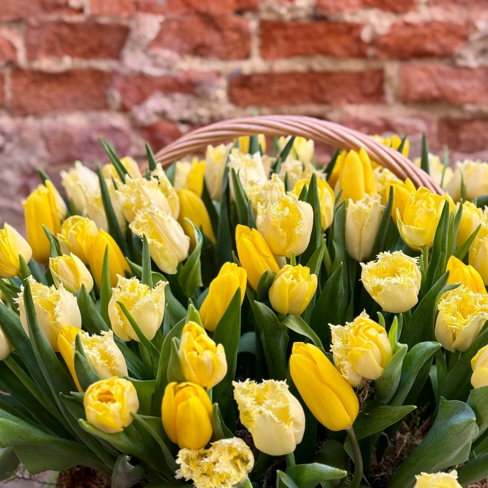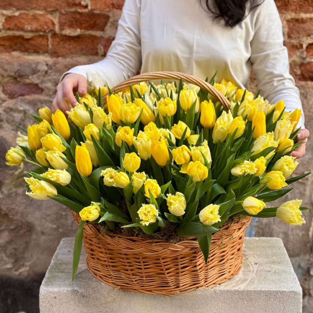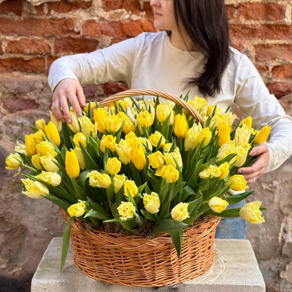 - Як замовити Весняний кошик із тюльпанів «Сонячний всесвіт»? ❯