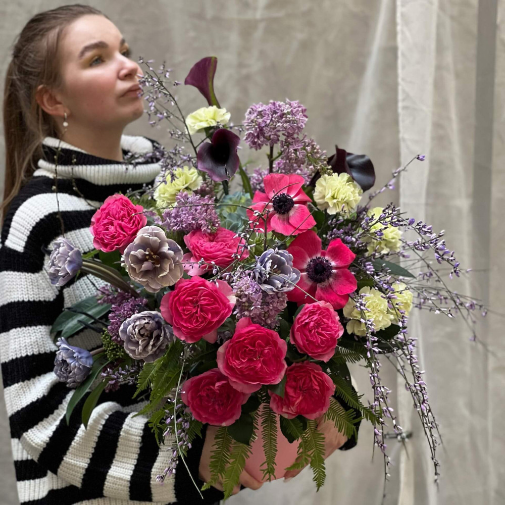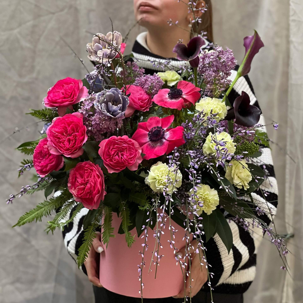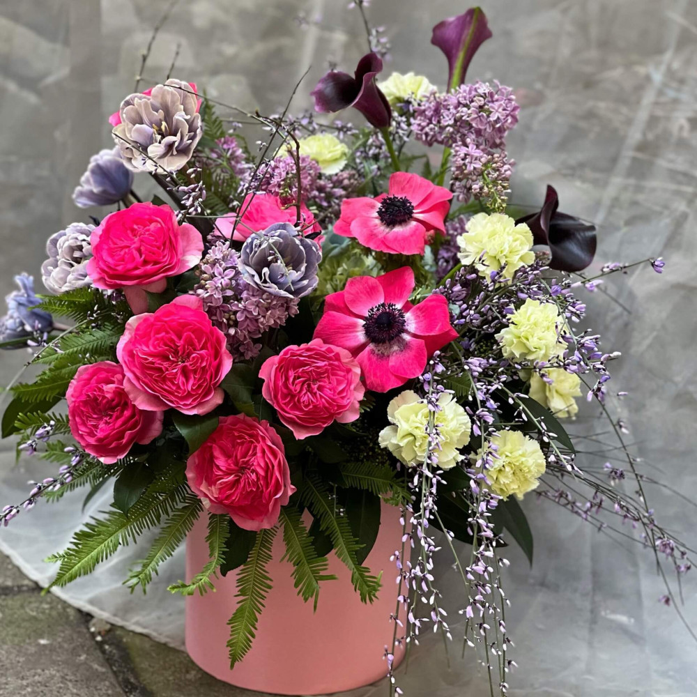 Елегантна композиція з цікавою кольоровою гамою - фіолетовий бузок, геніста та півонієподібні тюльпани скомпоновані з чудовою яскраво-рожевою півонієподібною трояндою та анемонами. В якості кольорових акцентів додано ніжний яблучно-зелений діантус і чорнильно-фіолетові кали. Листя папороті амбрели додає повітряності та легкості