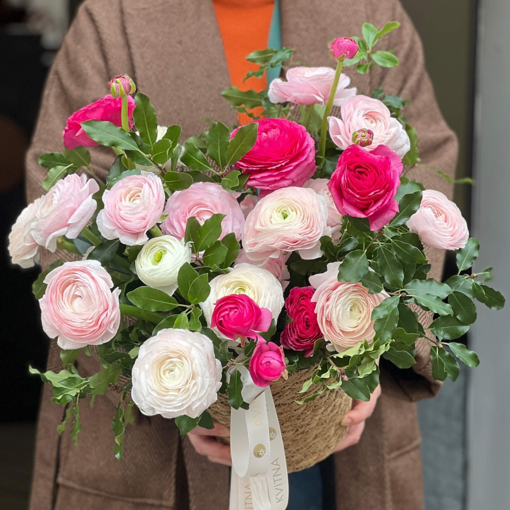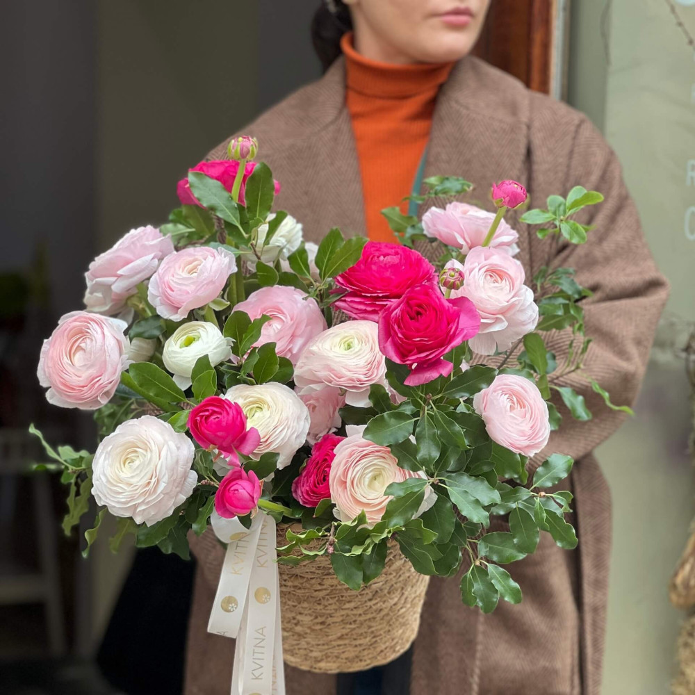 Ніжна і яскрава композиція в плетеному кошику з чудових повноквіткових ранункулюсів світло-рожевого та малинового кольорів. Їхню ніжність тонких до прозорості пелюсток гарно підкреслює насичена зелень піттоспорума.