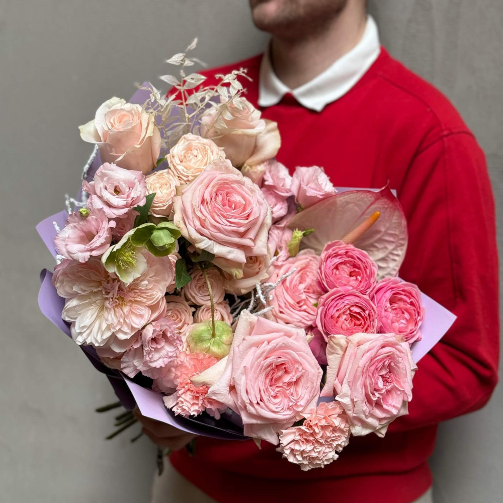 Квіти: Антуріум, Троянда піоновидна, Троянда піоновидна кущова, Діантус (Гвоздика), Хелеборус, Рускус, Еустома