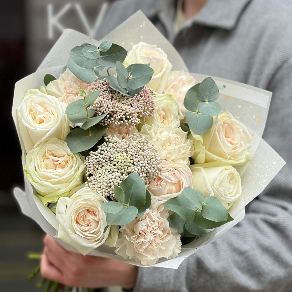 Квіти: Троянда піоновидна, Діантус (Гвоздика), Озотамнус, Евкаліпт