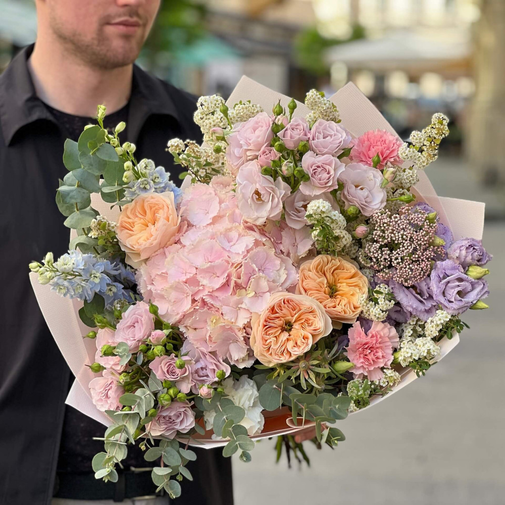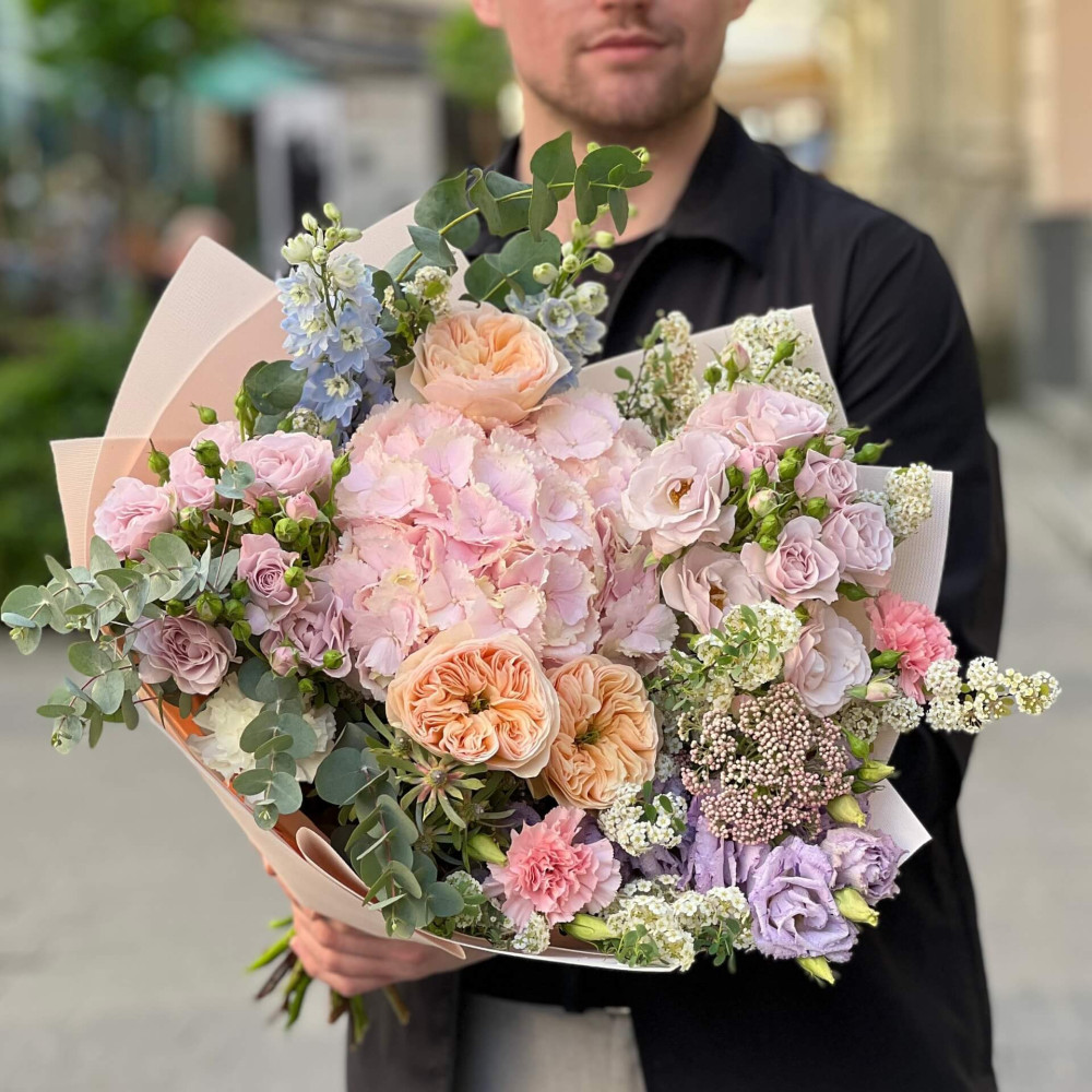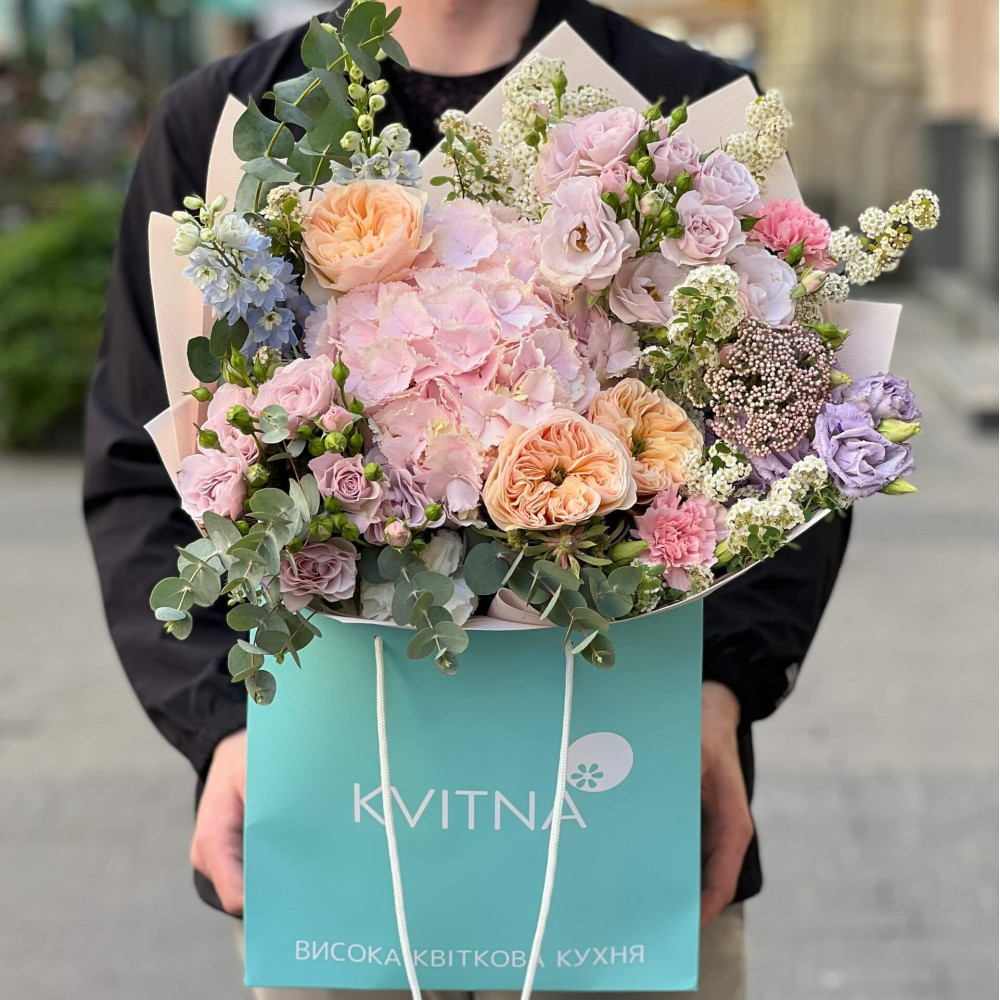 Квіти: Троянда кущова, Гортензія, Еустома, Евкаліпт, Спірея, Леукадендрон, Троянда піоновидна, Озотамнус, Дельфініум