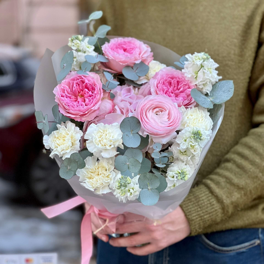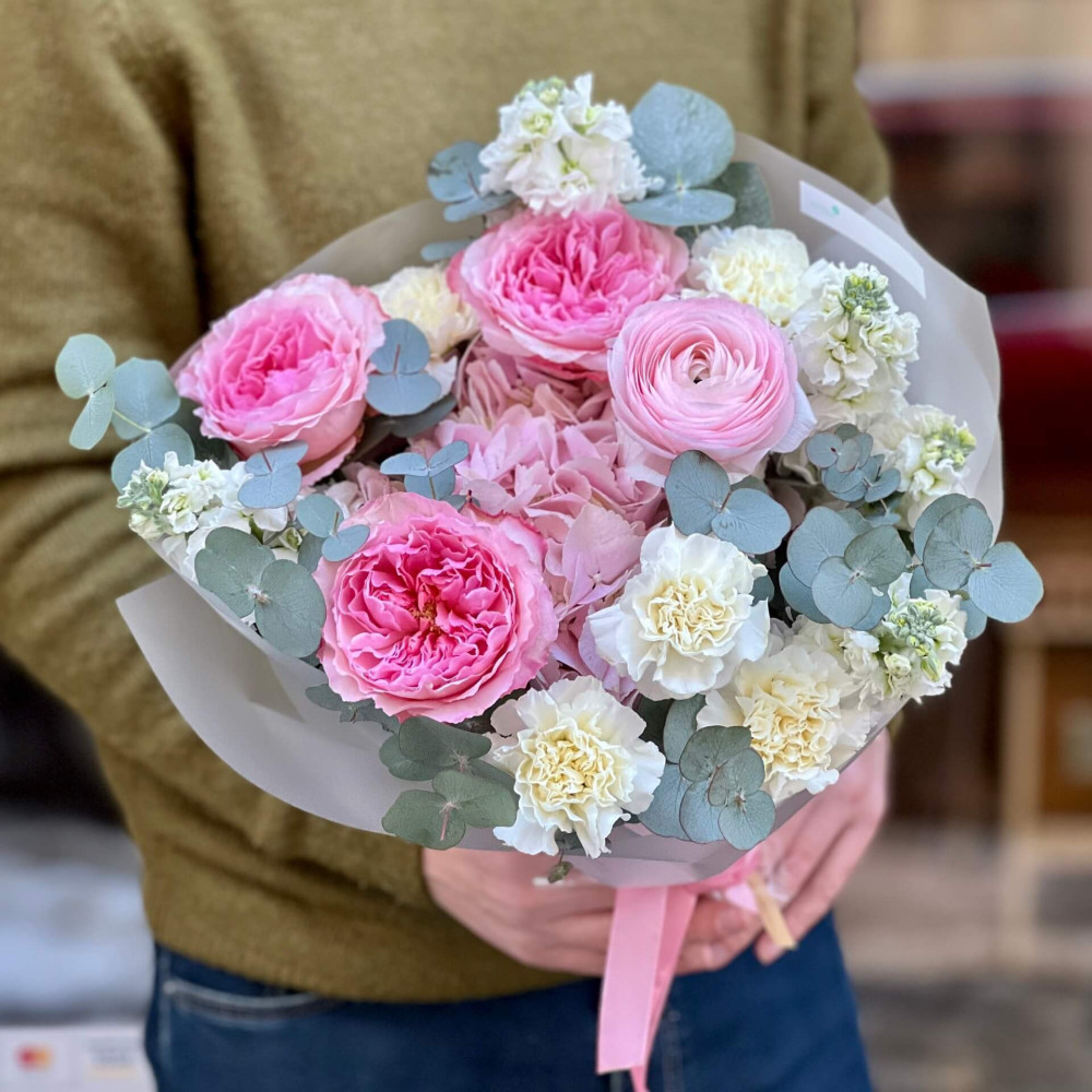 Квіти: Троянда піоновидна, Ранункулюс, Діантус (Гвоздика), Матіола, Евкаліпт, Гортензія