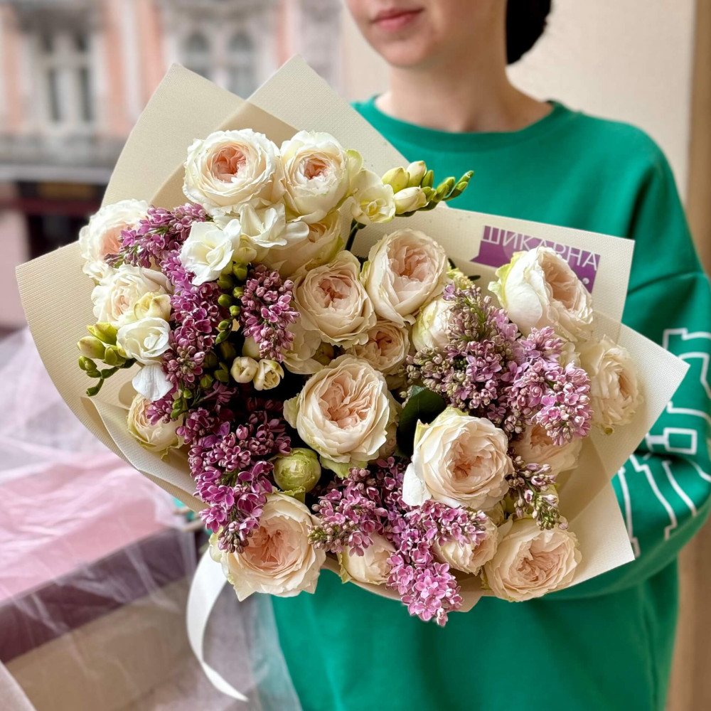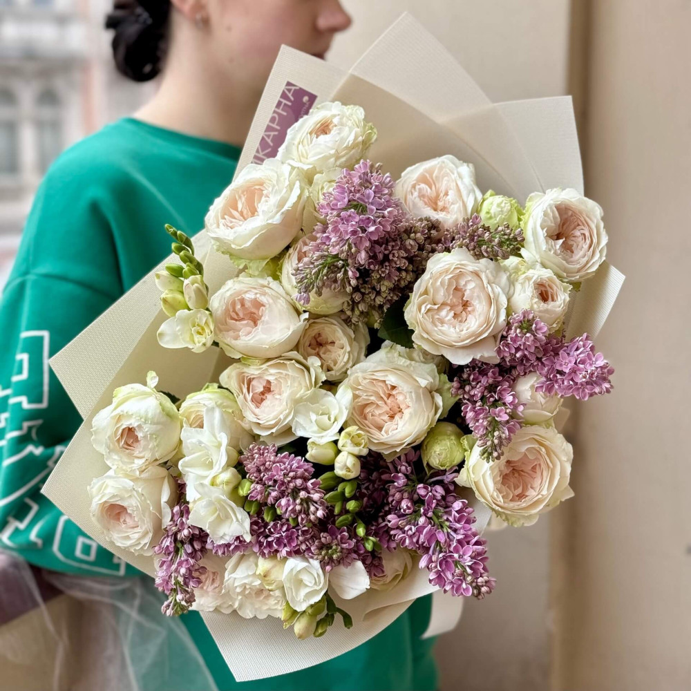 Квіти: Троянда піоновидна, Бузок, Фрезія