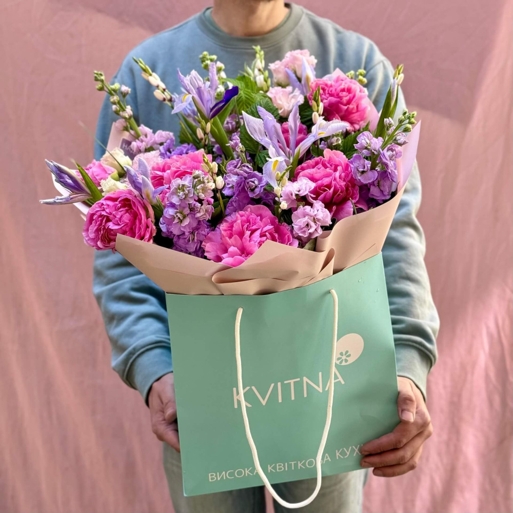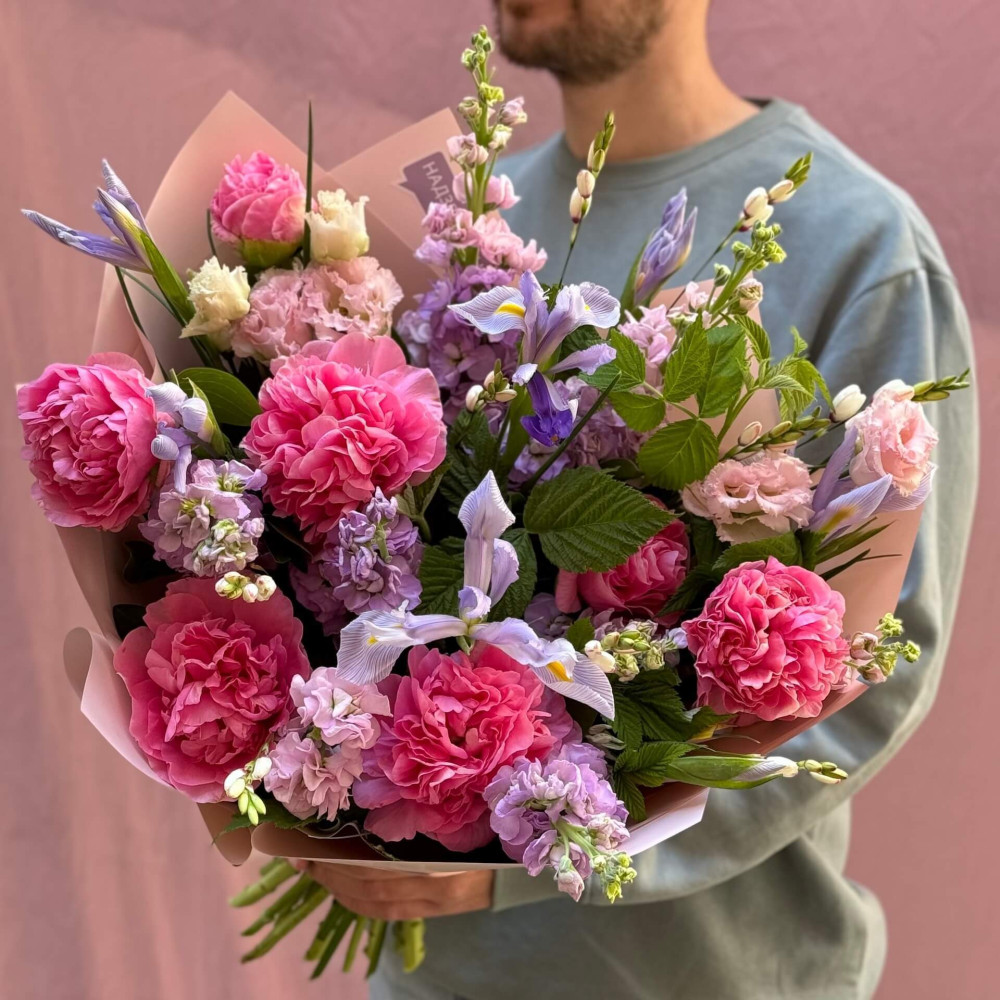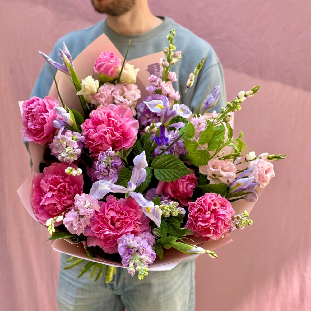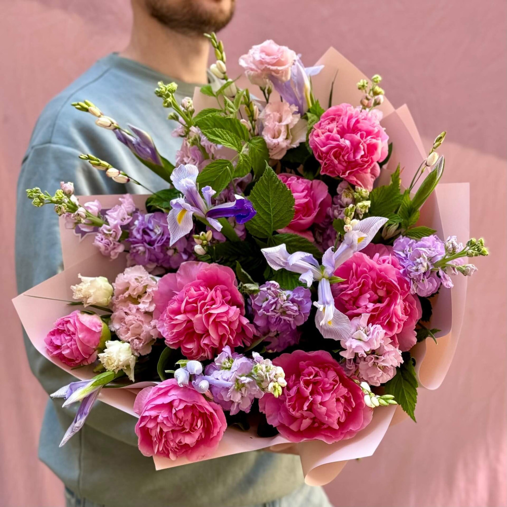 Квіти: Еустома, Матіола, Півонія, Малина (листя)