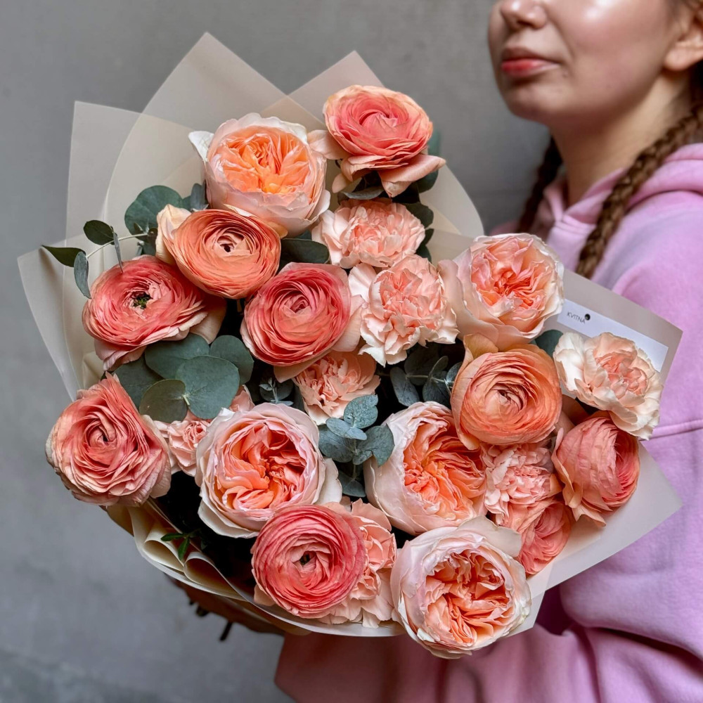 - Як замовити Вишуканий букет з ранункулюсами Venere та піоновидними трояндами Juliet «Пряний танжерин»? ❯