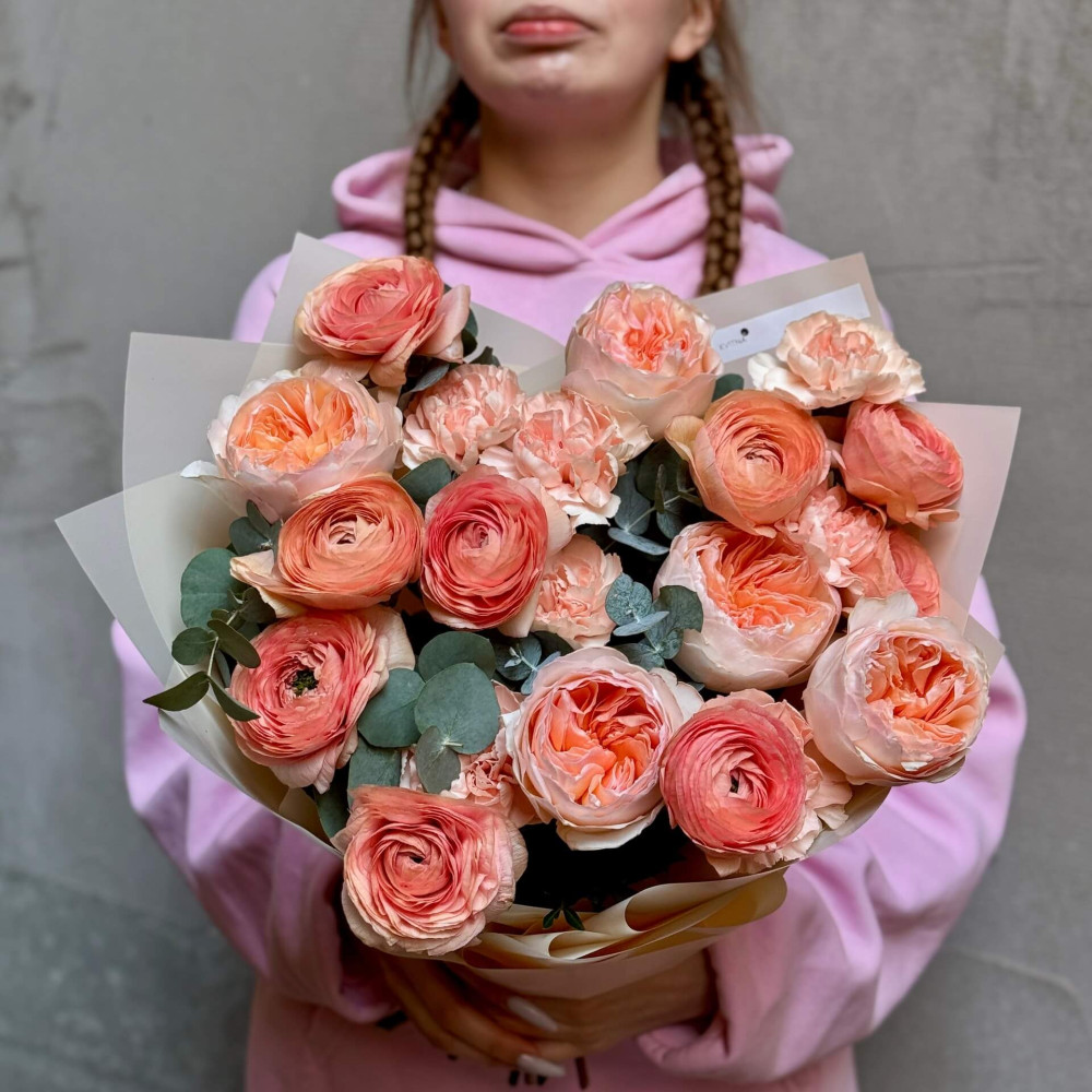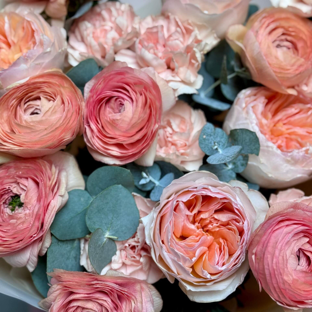 Квіти: Ранункулюс сорту Venere, Троянда піоновидна сорту Juliet, Діантус (Гвоздика), Евкаліпт