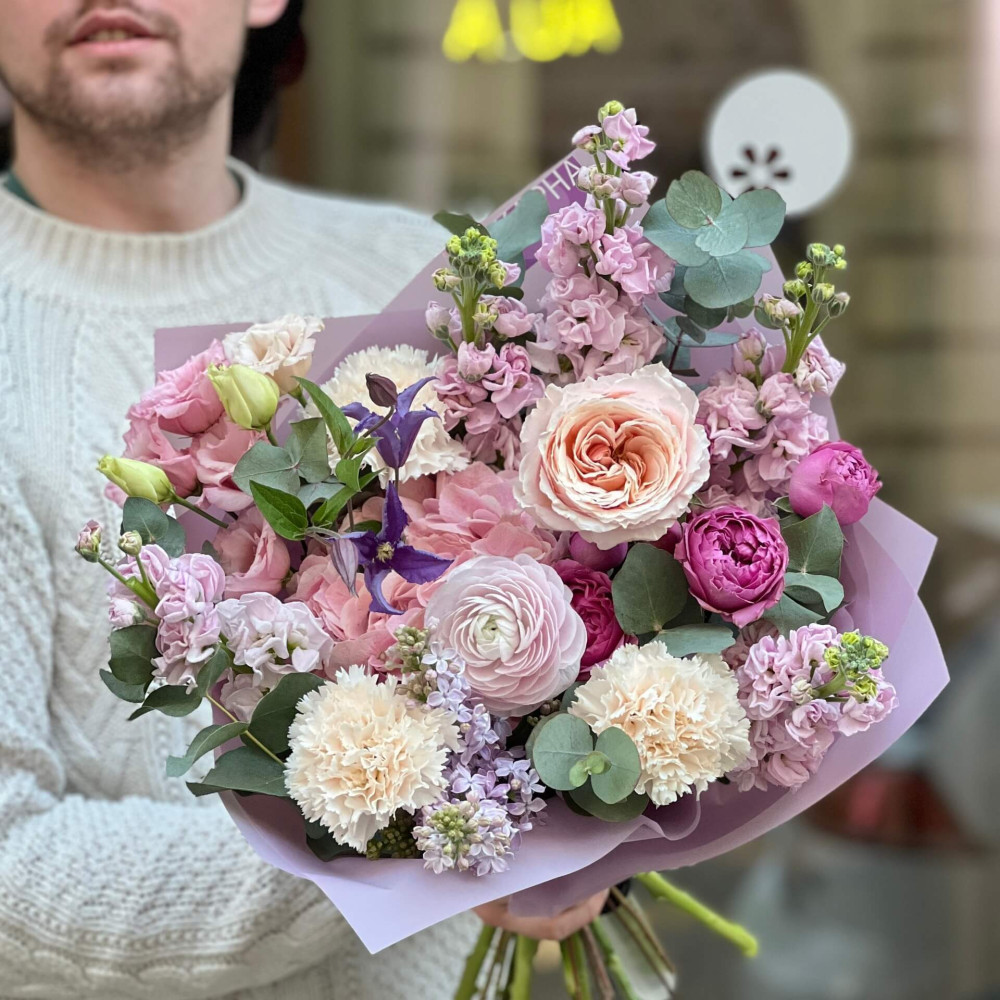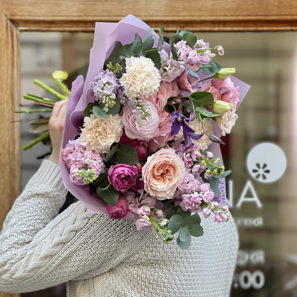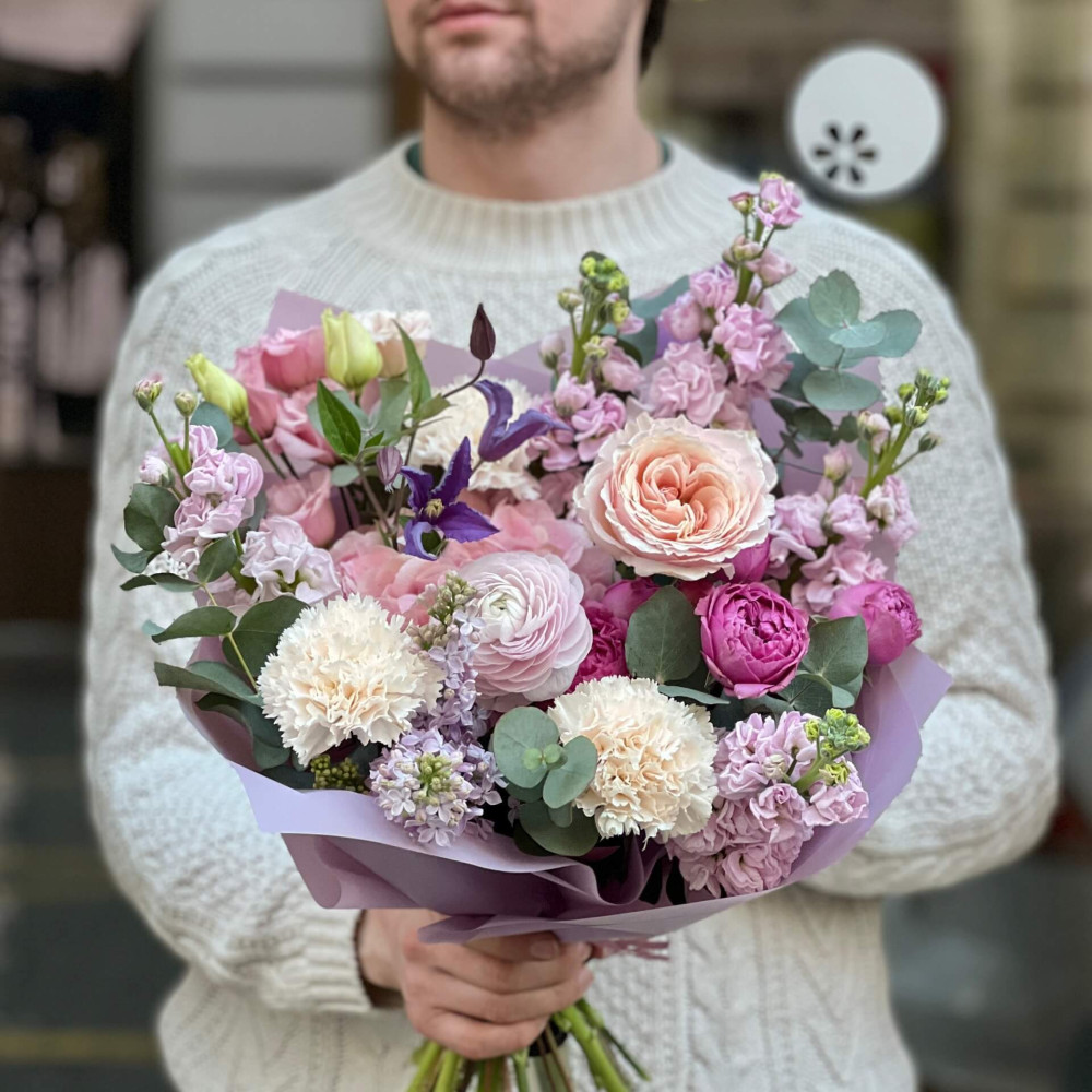 Квіти: Троянда піоновидна, Гортензія, Ранункулюс, Матіола, Клематіс, Діантус (Гвоздика), Троянда піоновидна кущова, Евкаліпт, Бузок, Еустома