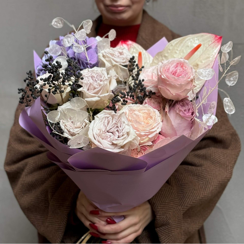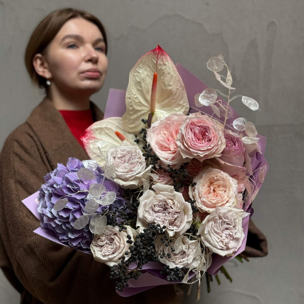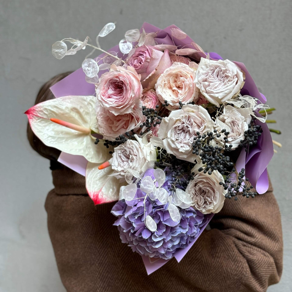 Квіти: Гортензія, Троянда піоновидна сорту Tsumugi, Вібурнум (ягоди), Лунарія, Антуріум