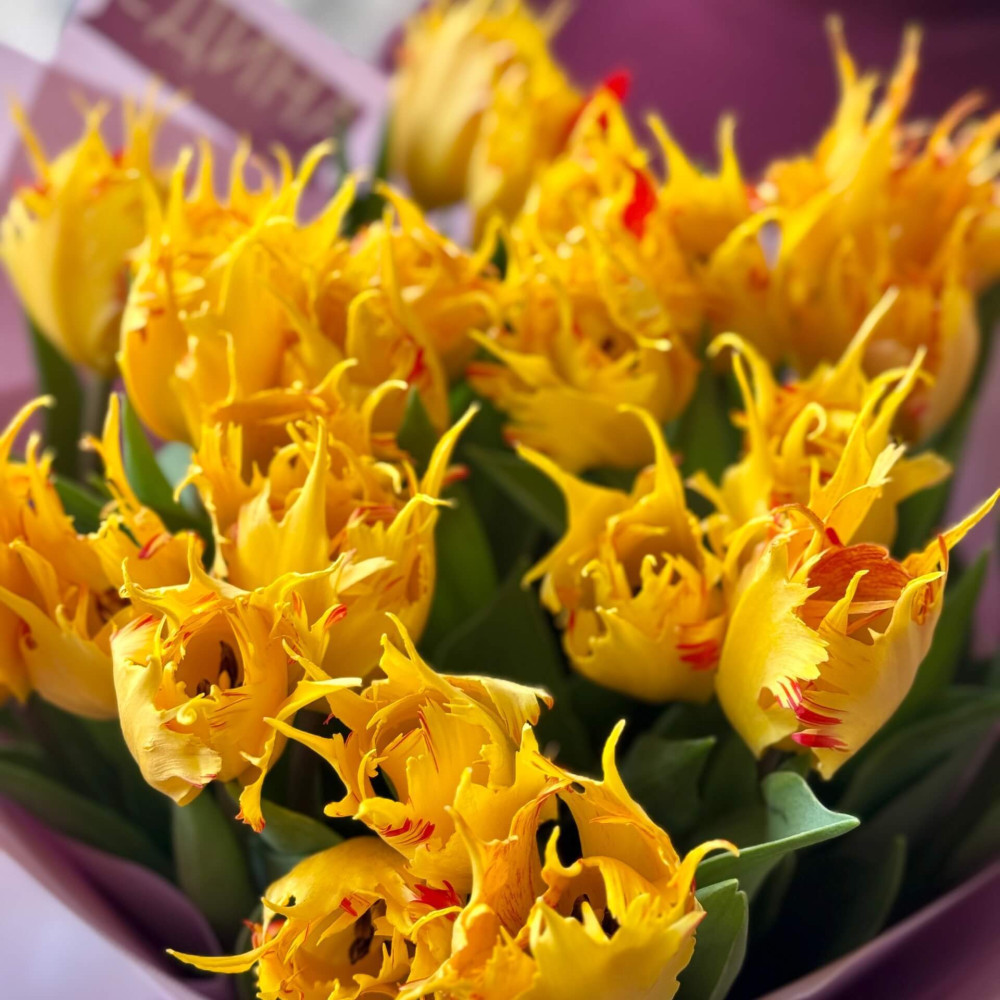 - Як замовити Витончені жовтогарячі французькі тюльпани у букеті «Яскраві іскри»? ❯